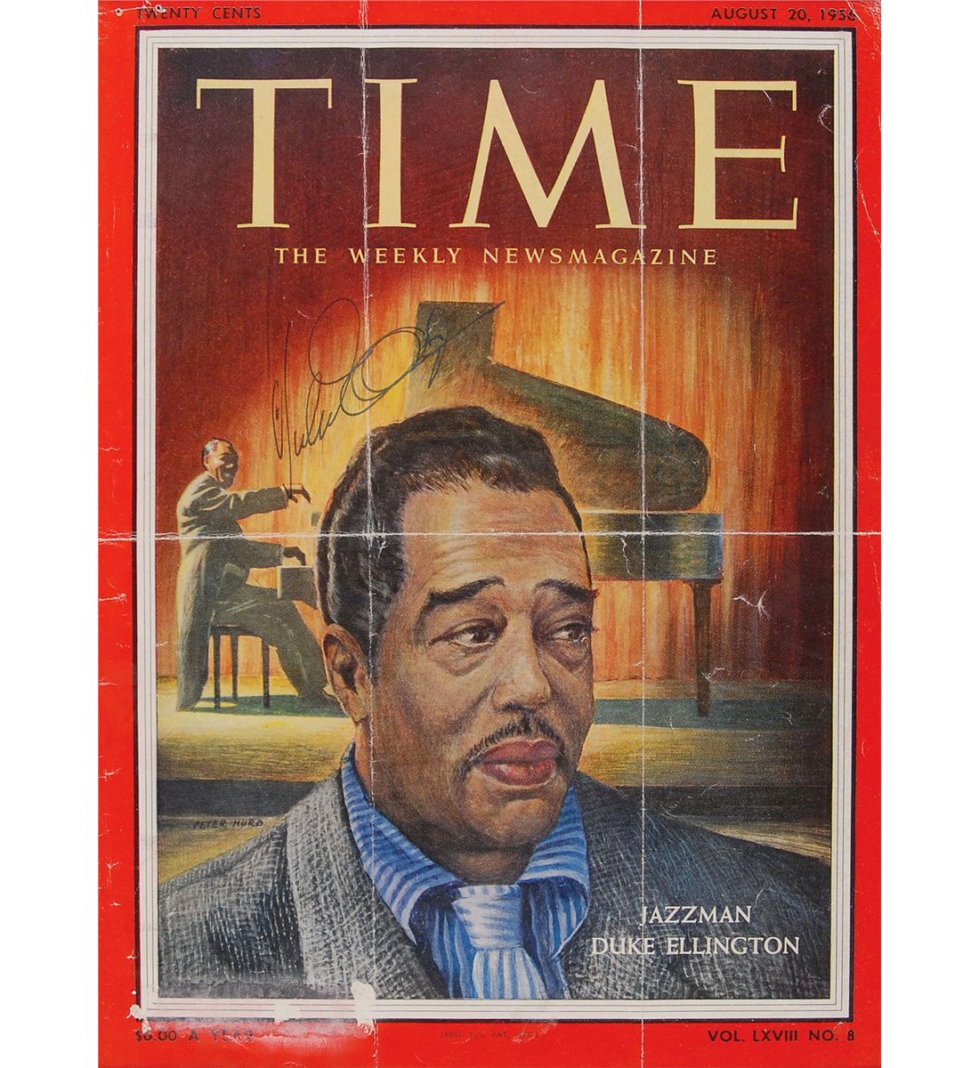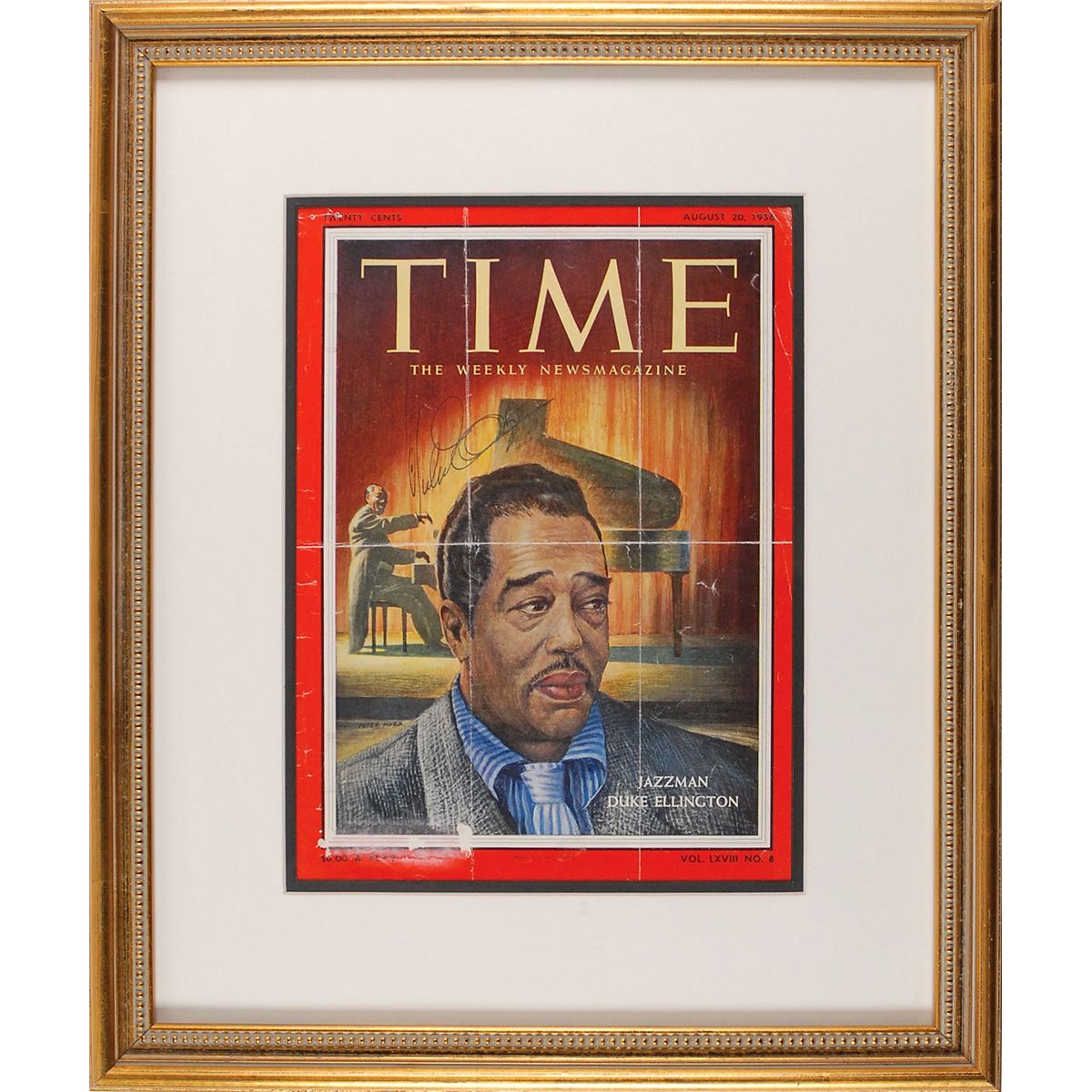 Cover from the August 20, 1956, issue of Time magazine, 8 x 10.75, signed in fountain pen. Double-matted and framed to an overall size of 14.5 x 17.5. In very good condition, with noticeable intersecting folds, scattered creases, and adhesive remnants to the lower left from the previously affixed address label.