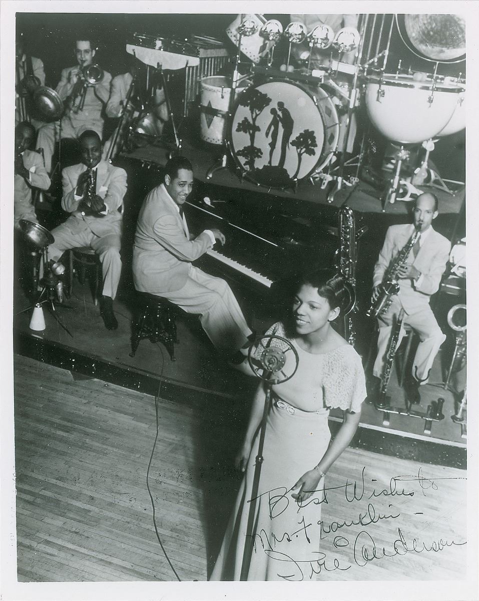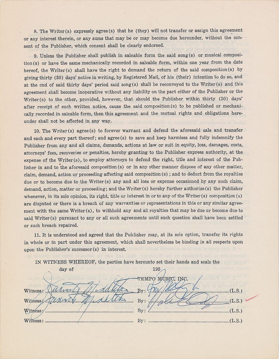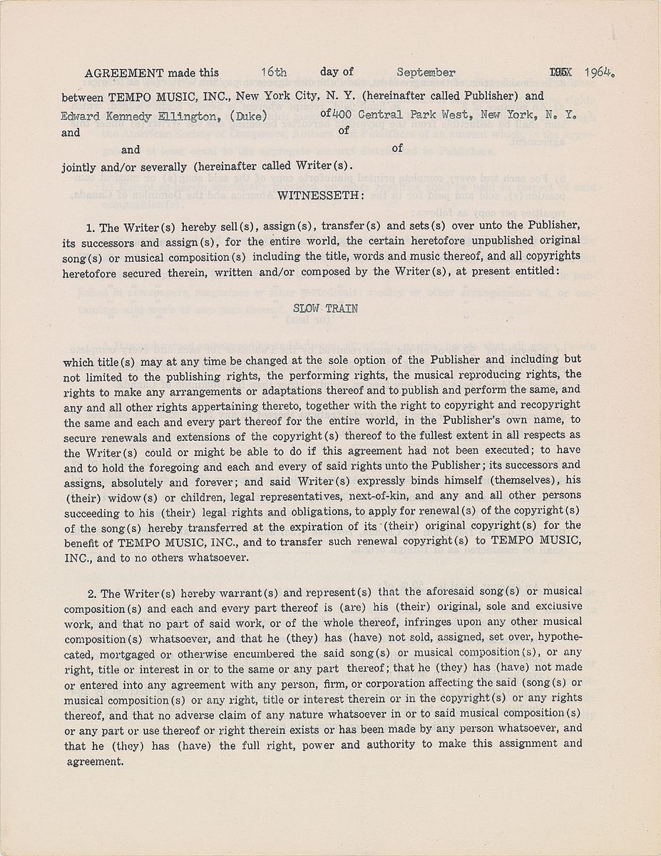DS, four pages on two adjoining sheets, 8.5 x 11, September 16, 1964. Agreement between Tempo Music, Inc., and Ellington in which the latter transfers all rights to a musical composition “at present entitled: Slow Train.” Signed at the conclusion in blue ballpoint by Ellington. In fine condition. Accompanied by an unsigned glossy photo bearing a facsimile signature.