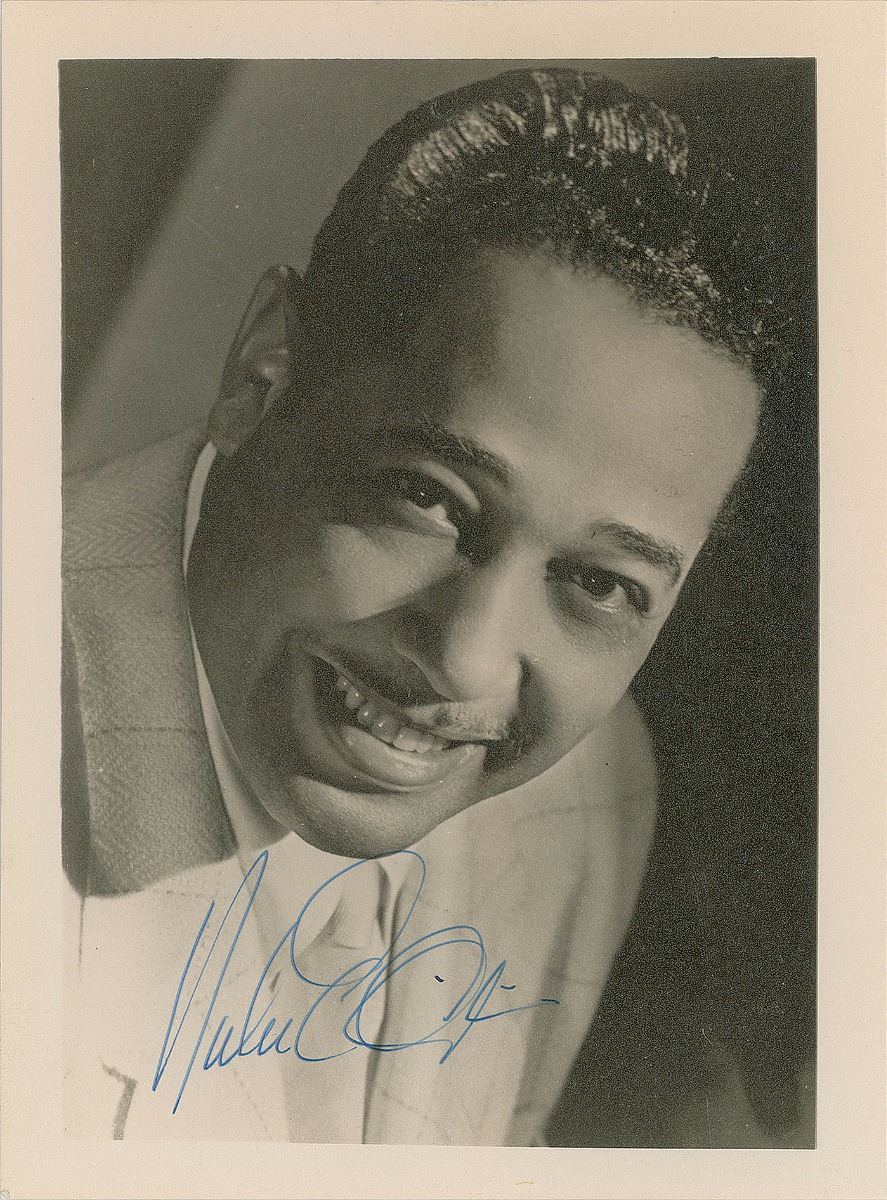 Appealing matte-finish 5 x 6.75 photo of Ellington, signed in blue fountain pen. In fine condition. Accompanied by the original mailing envelope, postmarked Chicago, 1967. Pre-certified PSA/DNA.