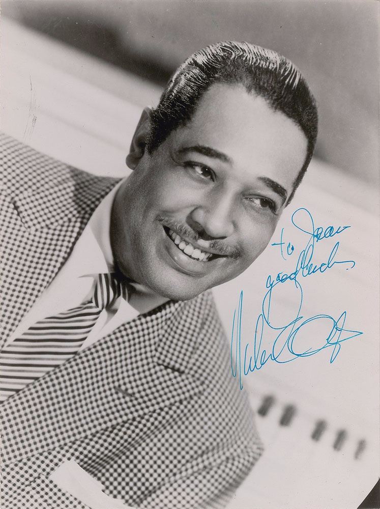 American composer, pianist, and bandleader of a jazz orchestra, (1899–1974) which he led from 1923 until his death in a career spanning over fifty years. Vintage glossy 7 x 9.5 photo of Ellington with a bright smile and wearing a patterned coat, signed and inscribed in blue fountain pen, "To Jean, good luck, Duke Ellington.” In fine condition.