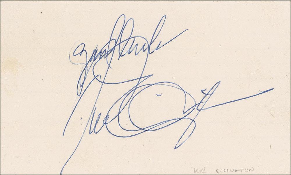 Ballpoint signature, “Good luck, Duke Ellington,” on an off-white 5 x 3 card. In fine condition, with a bit of light soiling to left edge, and a small collector’s notation to bottom.