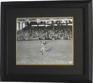 Duke Snider was an 8 time All-Star selection and 2 time World Series champion. He was nicknamed "The Silver Fox" and "The Duke of Flatbush" who played with the Brooklyn and Los Angeles Dodgers (1947–62), New York Mets (1963), and San Francisco Giants (1964). He was elected to the Baseball Hall of Fame in 1980. Duke Snider has hand autographed this Brooklyn Dodgers Black & White Jumping 16x20 Photo with HOF 80 inscription. JSA Hologram and Certificate of Authenticity. Custom Black Mat and Premium Black Color Framed as shown