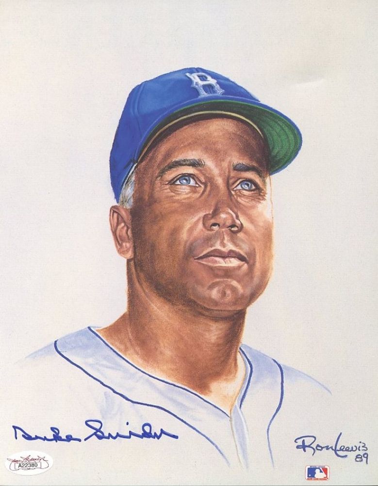 8x10 lithograph hand-signed in blue felt tip pen by Duke Snider (D 2011). The print is limited edition and numbered on the reverse #3588 of 5000. The autograph includes a JSA COA for authenticity purposes. The photo has a small handling crease on the surface.