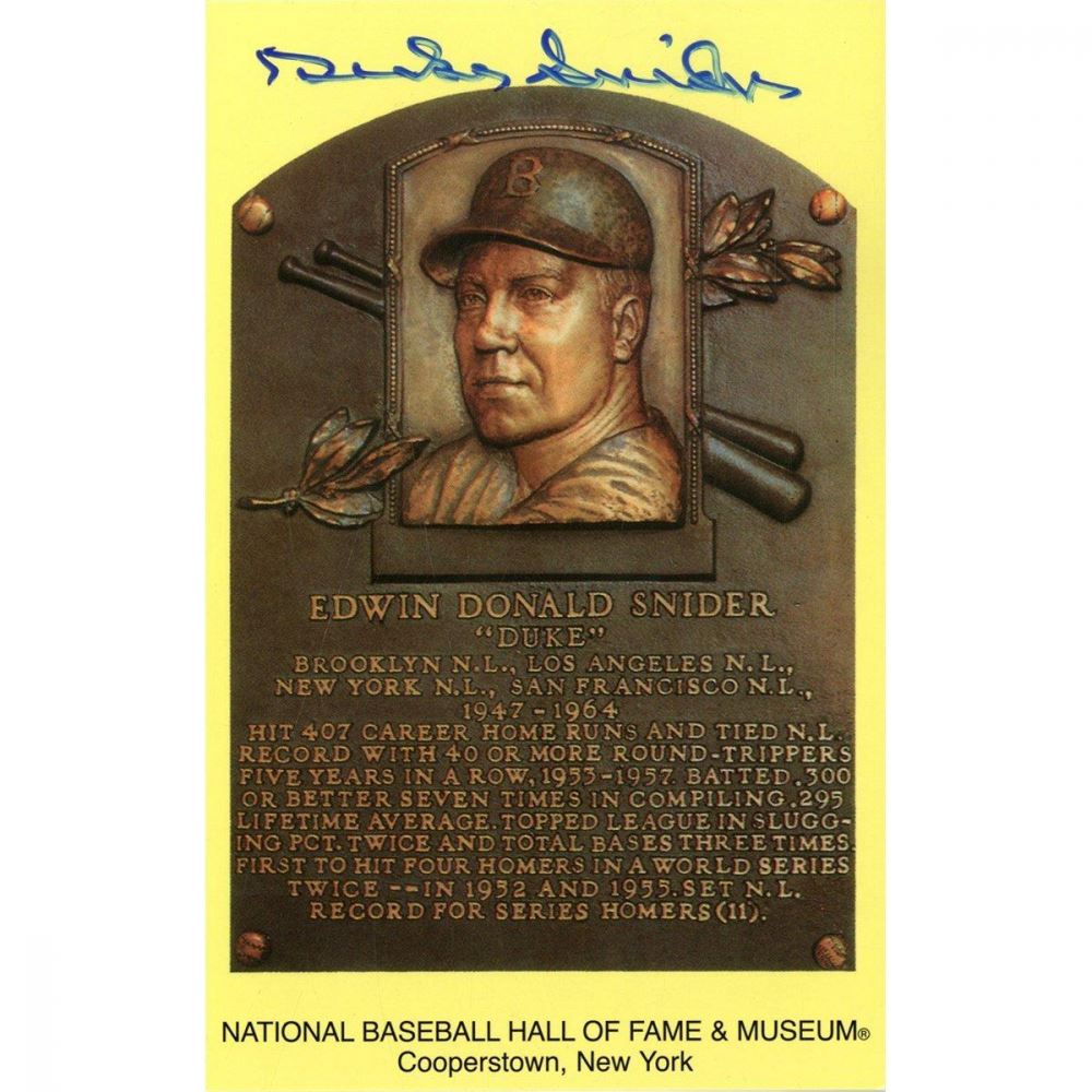 Gold Hall of Fame postcard has been hand-signed in blue felt-tip pen by Duke Snider (D. 2011, Dodgers HOF).