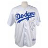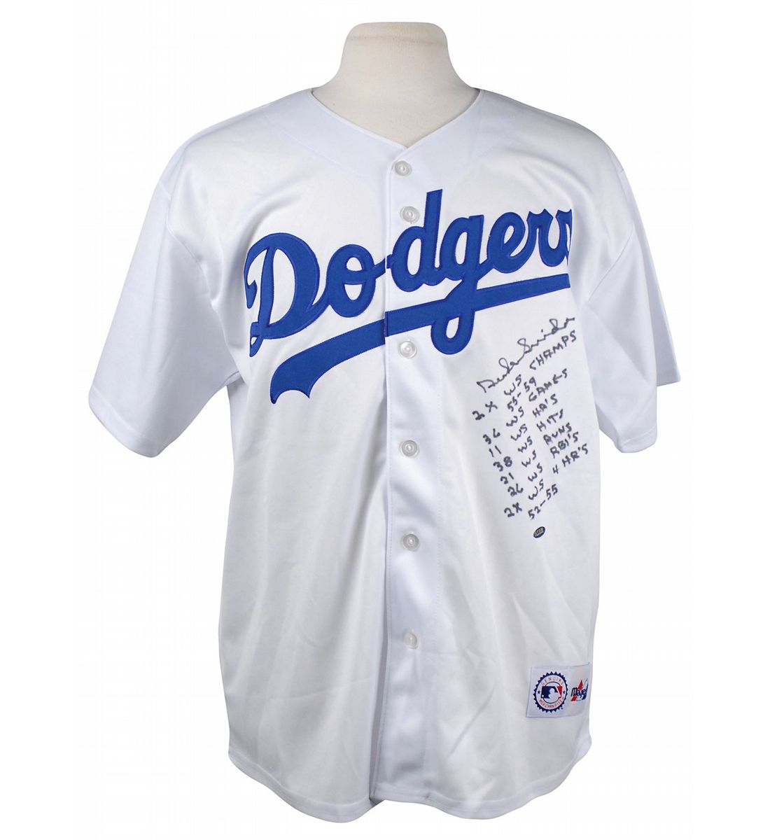 Official Majestic replica Dodgers baseball jersey, with sewn on letters and numbers, signed in black felt tip on the front, with Snider adding a slew of his statistics from his many World Series appearances. In fine condition.