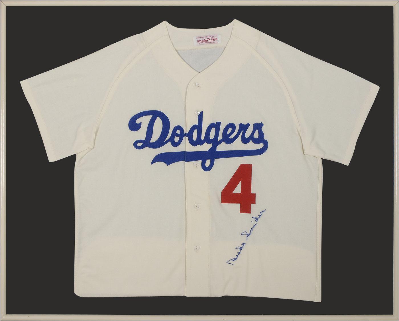 Official Mitchell & Ness replica Brooklyn Dodgers baseball jersey, with sewn on letters and numbers, signed in blue felt tip on the front. Framed to an overall size of 41 x 33. In fine condition. Oversized. Pre-certified Steve Grad/PSA/DNA and RRAuction COA.