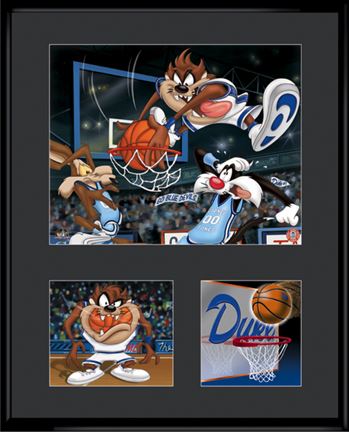 This 16x20 framed lithograph features our favorite Looney Tunes characters. Taz as a Duke players leaps over Wile E. Coyote and Sylvester to slam dunk the basketball. Collegiate and WB licensed. Limited edition - 5,000. COA