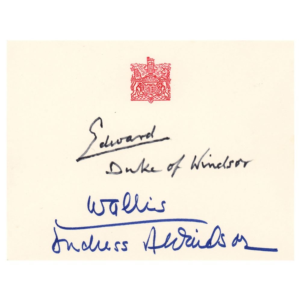 Felt tip signatures, "Edward, Duke of Windsor" and "Wallis, Duchess of Windsor,†on an off-white 4.5 x 3.5 stationery card bearing the Arms of the Duke of Windsor. In very fine condition.
