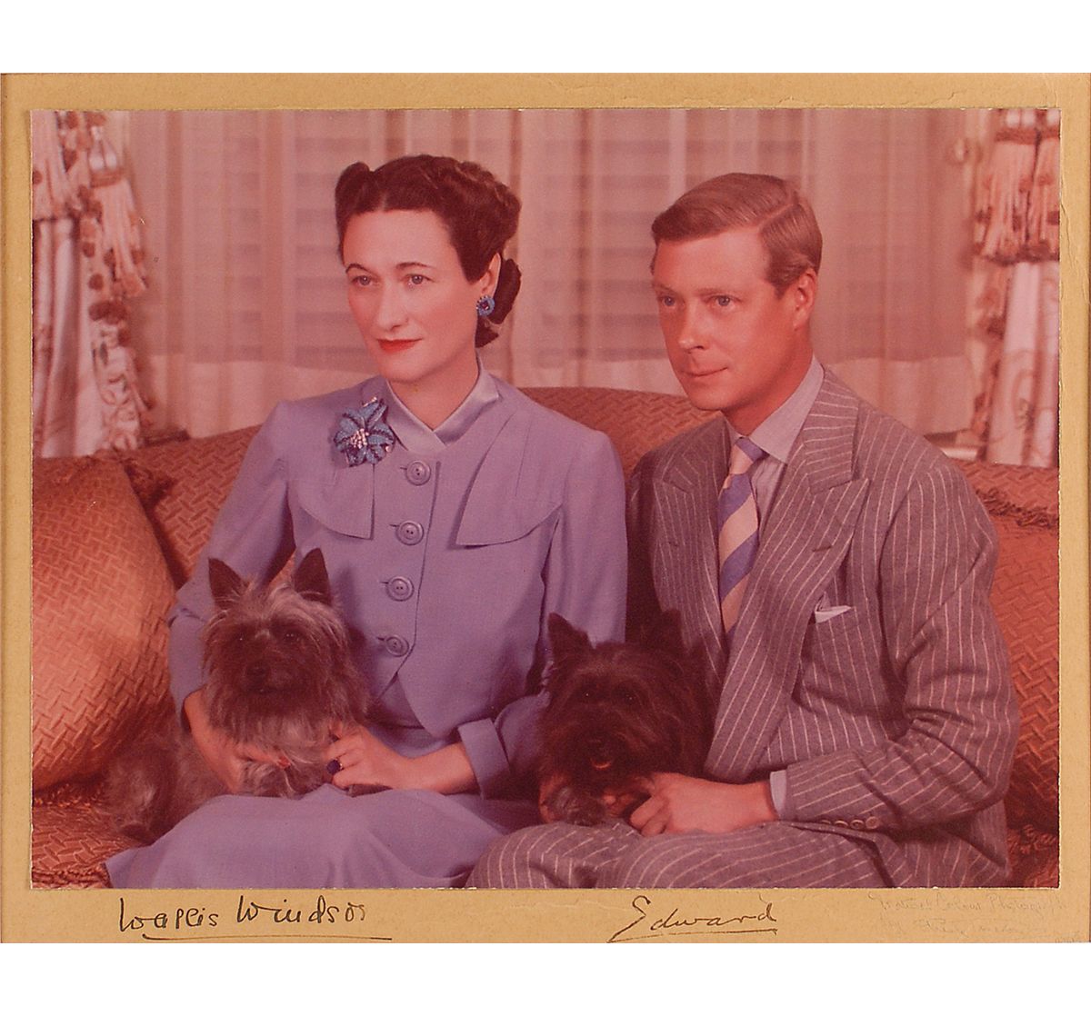 Color matte-finish 12.5 x 9.25 photo of the Duke and Duchess with their beloved dogs affixed to a slightly larger mount, signed on the mount in fountain pen “Edward” and “Wallis Windsor.” Matted to an overall size of 19.25 x 16.25. Scattered creasing to the mount, some affecting the signatures, and a light pencil notation about the photographer to the lower right, otherwise fine condition. An incredibly scarce item, this is the first portrait we have offered signed by both the Duke and Duchess. It is a great pose, too, as the controversial couple were well known dog-lovers.