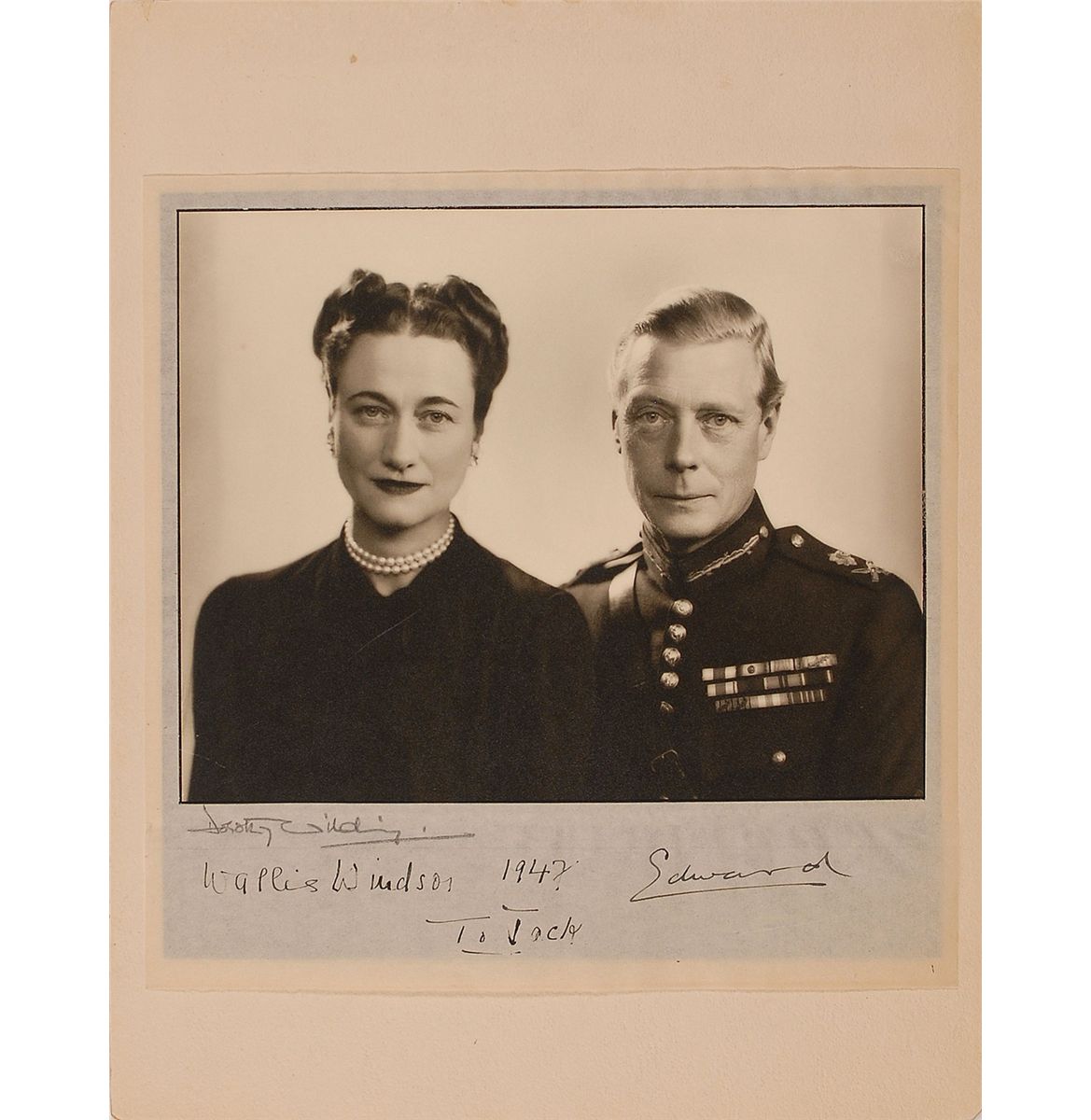Rare vintage matte-finish 9.25 x 7.25 portrait of the Duke and Duchess, affixed to a 10.25 x 10.25 onionskin sheet, signed on the sheet in black ink “Edward,” and signed and inscribed “Wallis Windsor, 1947, To Jack.” Also signed in pencil by the photographer, Dorothy Wilding. Photo and sheet are in turn affixed to the original Wilding mount to an overall size of 11 x 14. In fine condition, with light wrinkles and toning to the onionskin sheet. Wilding was one of the most prolific photographers of royalty, and had the honor of photographing the royal family a number of times. Her famous portrait of Queen Elizabeth II was used for postage stamps issued in Great Britain and Canada, and she was the first woman awarded a Royal Warrant to be the official photographer to a King and Queen at their coronation. A wonderful, dignified portrait of the royal couple, and just the second we have offered signed by both the Duke and Duchess.