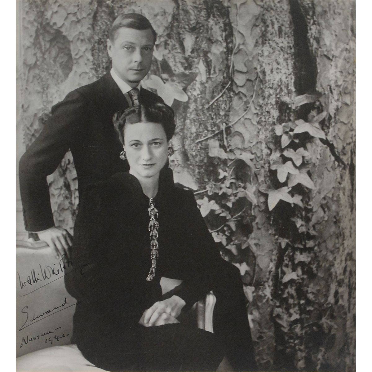 Superb vintage matte-finish 9 x 10 portrait of the Duke and Duchess of Windsor by Cecil Beaton affixed to a 11.75 x 15.75 mount, signed on the left side of the image in fountain pen, “Edward, Nassau—1941,” and “Wallis Windsor.” Also signed on the mount in red artist’s pencil, “Beaton.” Paper loss to the upper left corner of the mount, not affecting the photo or its immediate border (could be easily matted out), otherwise fine condition. A fantastic portrait by one of the period’s most famous British photographers, and one of a scant handful of photos signed by both the Duke and Duchess that we have encountered.