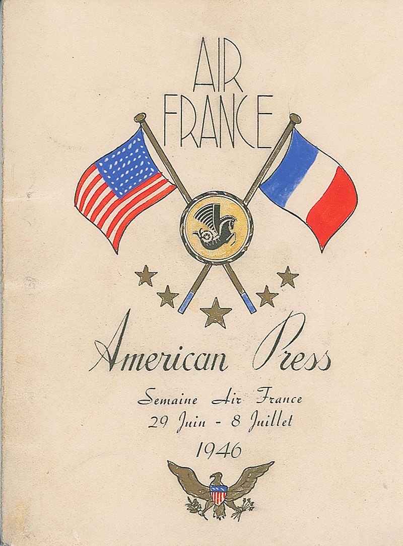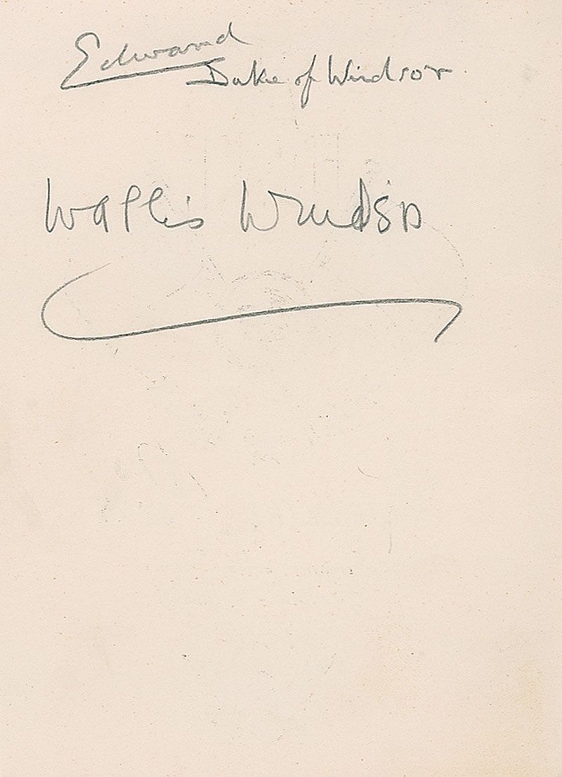 Program of the “Air France Week,” held from June 29 to July 8, 1946, 4 x 5.75, containing their itinerary for the week, signed on the inside front cover in pencil, “Edward, Duke of Windsor,” and “Wallis Windsor.” Scattered creasing and handling wear, as well as some light soiling to covers, and a couple pencil notations to back cover, otherwise fine condition.