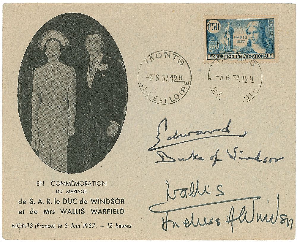 Commemorative cover, 6 x 5, with a cachet honoring their 1937 marriage, signed in black ink, “Edward, Duke of Windsor,” and “Wallis, Duchess of Windsor.” In fine condition, with some scattered light wrinkling.