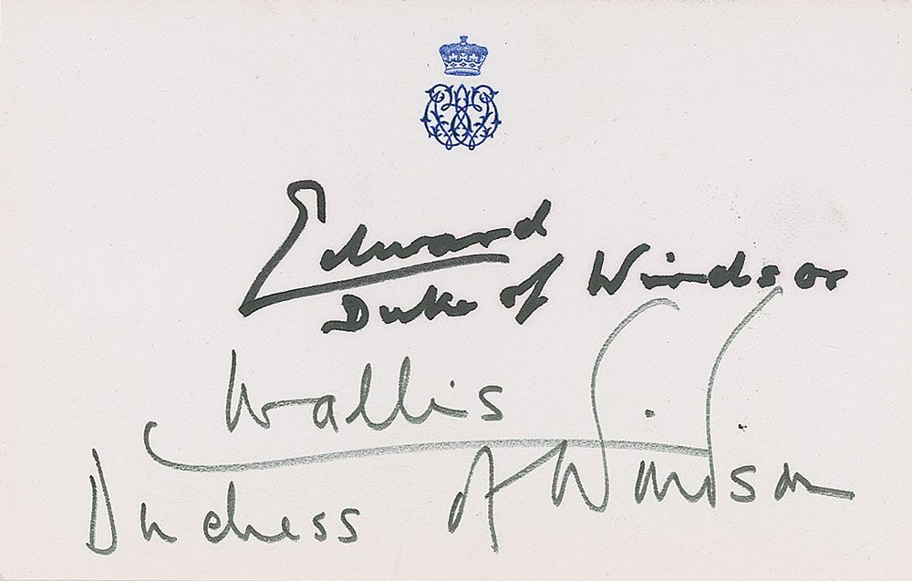 Felt tip signatures, “Edward, Duke of Windsor” and “Wallis, Duchess of Windsor,” on an off-white 5.25 x 3.5 card bearing an embossed crest. In fine condition.