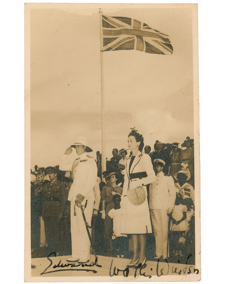 Uncommon matte-finish 3.25 x 5.5 real photo postcard of the Duke and Duchess below the famous Union Jack, boldly signed in fountain pen, “Edward” and “Wallis Windsor.” In fine condition, with trivial surface loss to lower right corner tip. A wonderful, patriotic image.