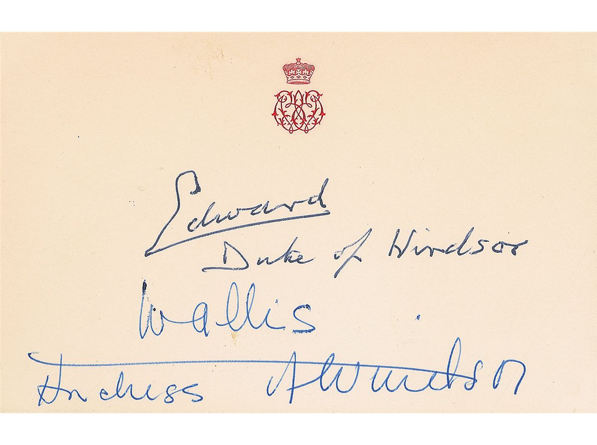 Ballpoint signatures, “Edward, Duke of Windsor” and “Wallis, Duchess of Windsor,” on an off-white 5.25 x 3.5 stationery card embossed with a royal crest. In fine condition.