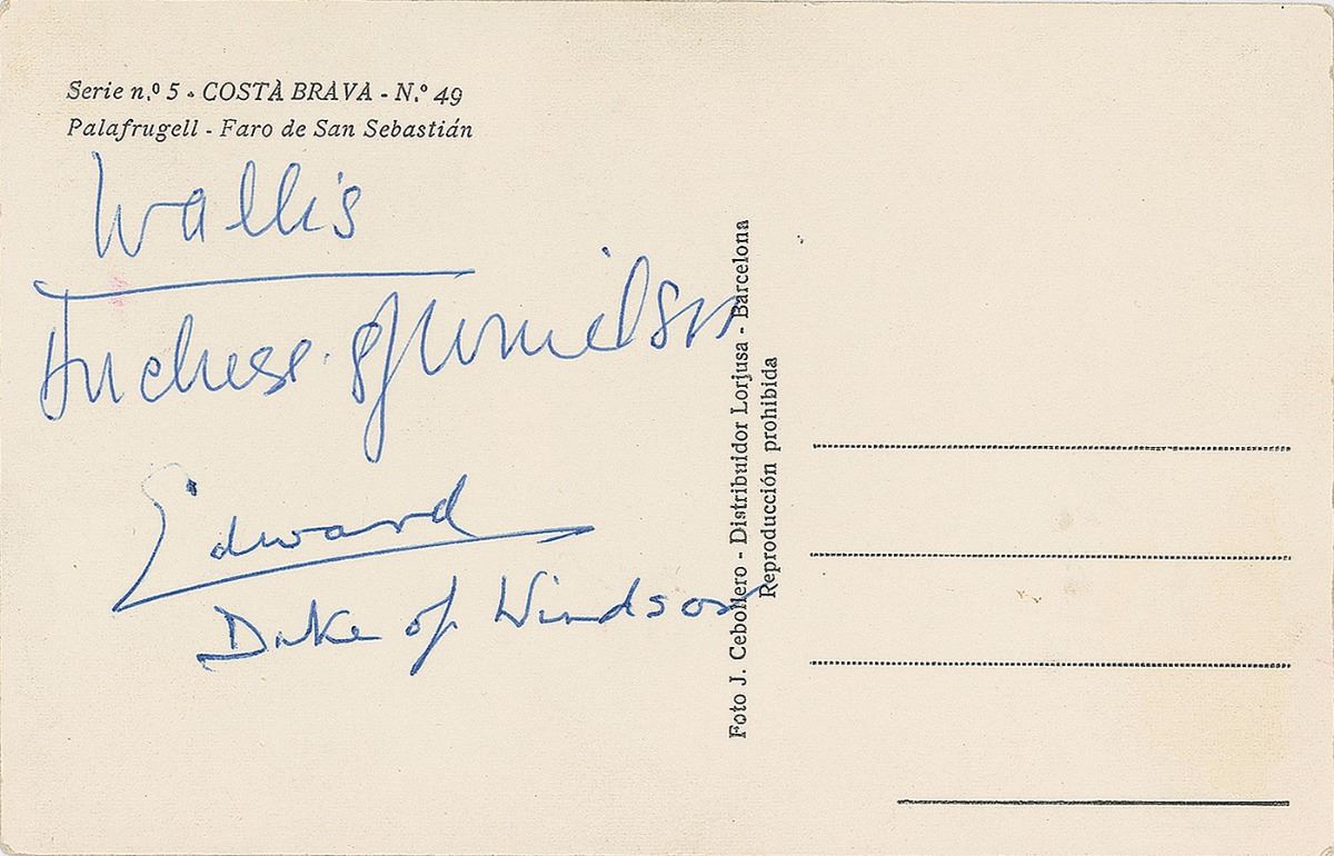 Ideal pairing of ballpoint signatures, “Edward, Duke of Windsor” and “Wallis, Duchess of Windsor,” on the reverse of a 5.5 x 3.5 postcard depicting the San Sebastian lighthouse. In fine condition. Accompanied by a small original candid photo of Wallis with the lady who obtained the autographs while the royal couple was vacationing in Costa Brava.