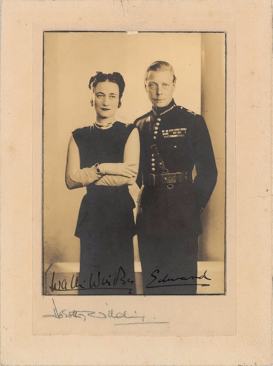 Attractive matte-finish 4 x 5.75 portrait of the Duke and Duchess of Windsor, affixed to the original 6 x 8 studio mount, signed in fountain pen by both, “Wallis Windsor” and “Edward.” Also signed by the photographer in pencil on the mount, “Dorothy Wilding.” Mounted and in very good to fine condition, with a fleck of missing emulsion and light silvering to the image, and a paperclip impression and edge tear to the trimmed mount (all easily matted out). Accompanied by a letter of provenance, in full: “When the Duke of Windsor was Governor General of the Bahamas, he and the Duchess used to dine with Sir Frederick Williams Taylor who lived at ‘The Wave’ Nassau. My father was chauffeur & secretary to Sir Frederick, and this photo was given to him by Sir Frederick.”