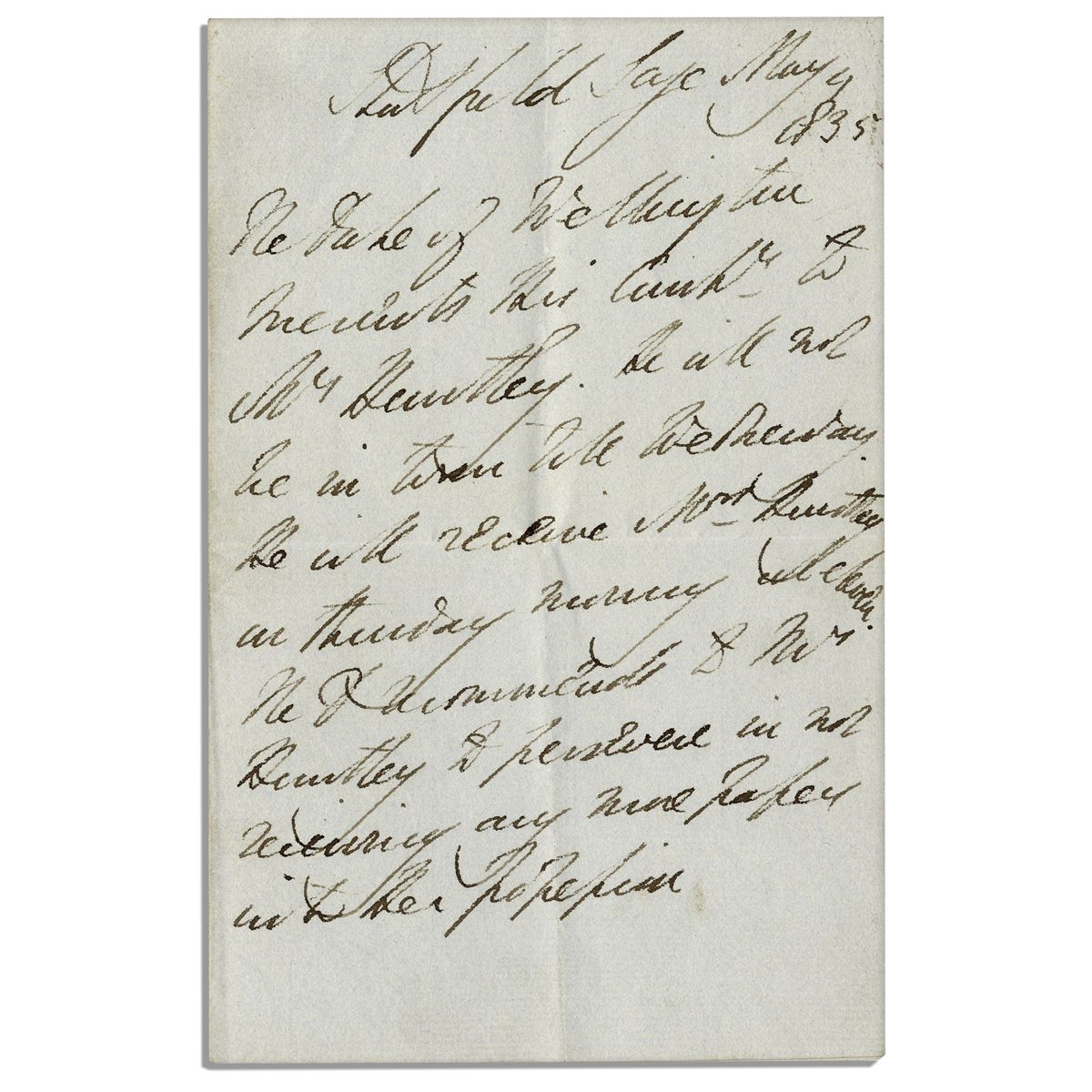 Duke of Wellington autograph letter in the third person, dated 4 May 1835. Reads in part: ''The Duke of Wellington presents his compl'ts to Mrs. Huntley. He will not be in town until Wednesday. He will receive Mr. Huntley on Thursday evening...'' Card-style letter on one page, with writing to cover measures 4.5'' x 7'' with minor creasing running both vertically and horizontally through letter, else very good condition.