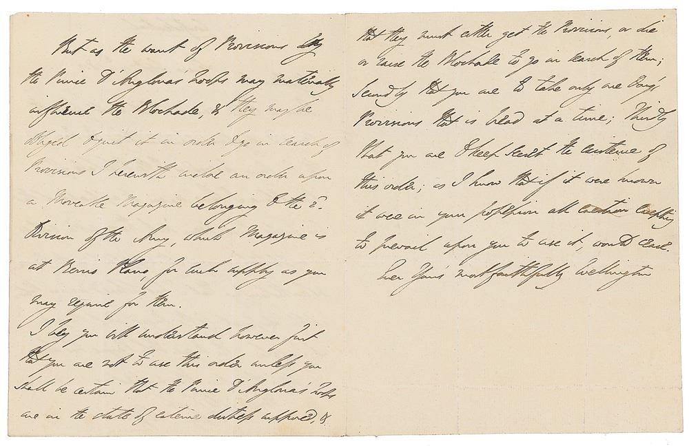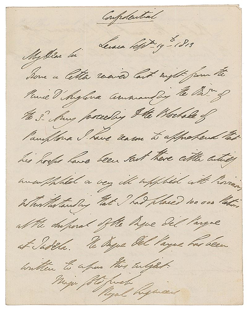 ALS signed "Wellington," three pages on two adjoining sheets, 7.25 x 9.25, September 19, 1813. Handwritten letter marked "Confidential," concerning the Peninsular War. In part: "From a letter received last night from the Prince D'Anglona commanding the Div'n of the 3d Army proceeding to the Blockade of Pamplona I have reason to apprehend that his Forces have been sent there either…undersupplied or very ill supported with Provisions notwithstanding that I had placed 100,000 Rations at the disposal of the Duque del Parque…But as the want of Provisions by the Prince D'Anglona's Troops may materially influence the Blockade, & they may be obliged to quit it in order to go in search of Provisions, I herewith inclose an order upon a moveable magazine belonging to the 2d Division of the Army…I beg you will understand however first that you are not to use this order unless you shall be certain that the Prince D'Anglona's troops are in the state of extreme distress supposed, & that they must either get the Provisions, or die or raise the Blockade to go in search of them." In fine condition. The siege of Pamplona lasted into October, when the French were forced to surrender.