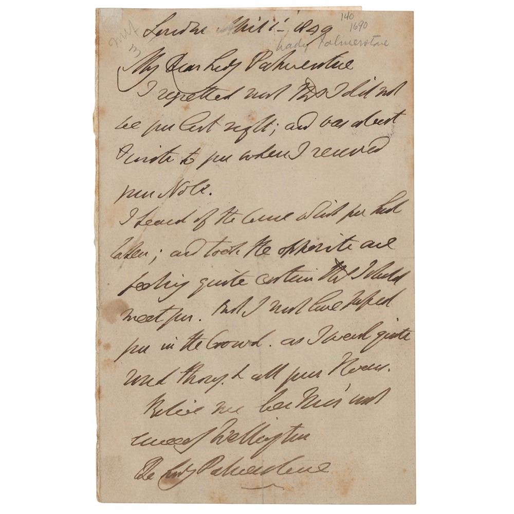 ALS signed ‰ÛÏWellington,‰Û one page, 4.5 x 7.25, April 1, 1849. Handwritten letter to a lady, in part: "I regretted‰Û_that I did not see you last night; and was about to write to you when I received your Note." In very good to fine condition, with light soiling and scattered staining.