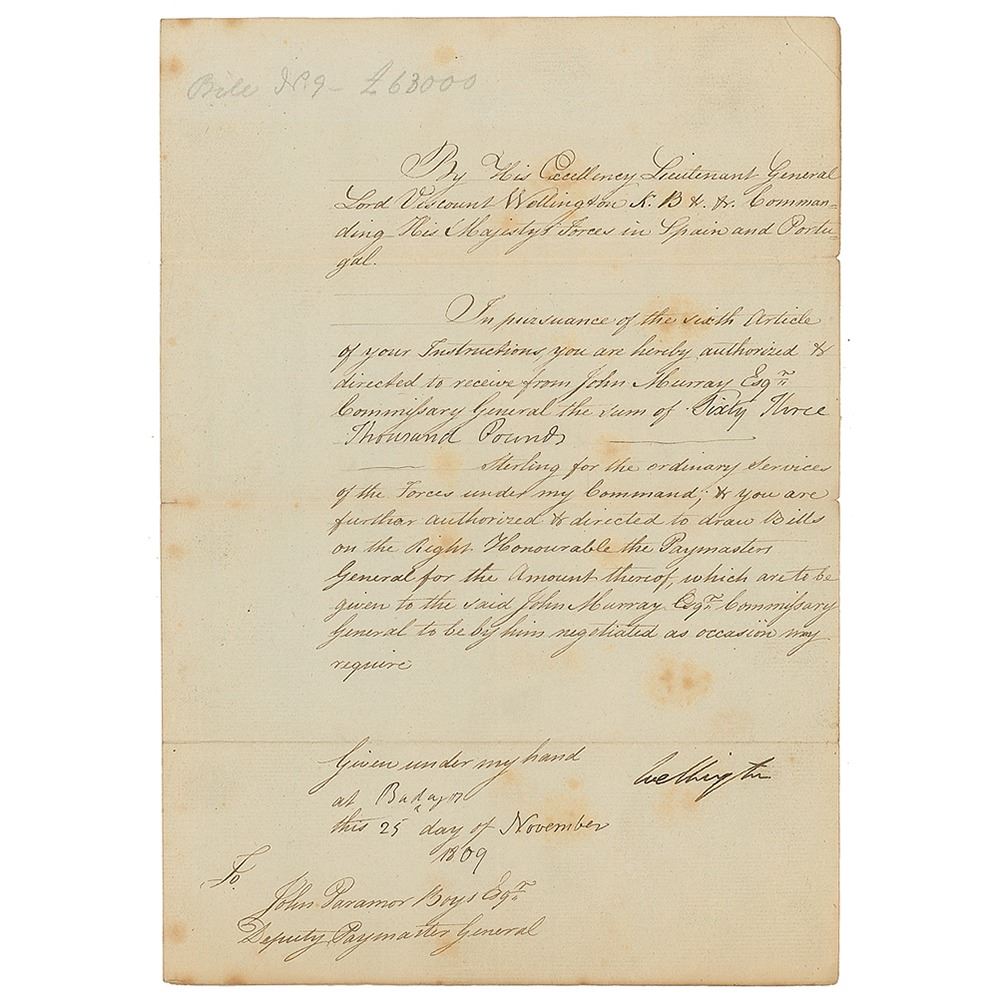 Manuscript DS, signed “Wellington,†one page, 8.25 x 12, November 25, 1809. Document issued during the Peninsular War, directing Deputy Paymaster General John Paramor Boys "to receive from John Murray Esqr. Commissary General the sum of Sixty Three Thousand Pounds Sterling for the ordinary services of the Forces under my Command." In very good to fine condition, with scattered light foxing.