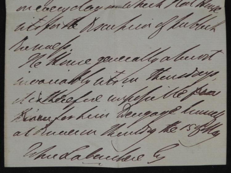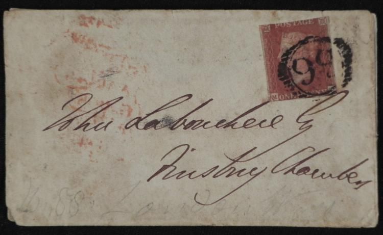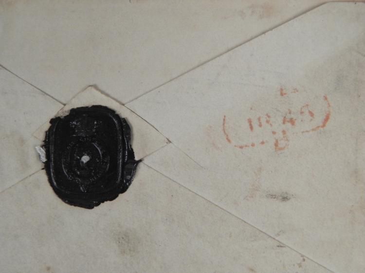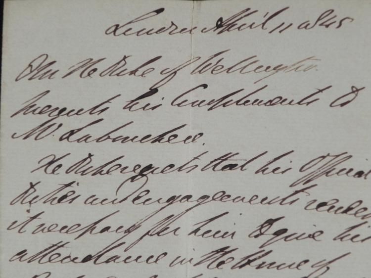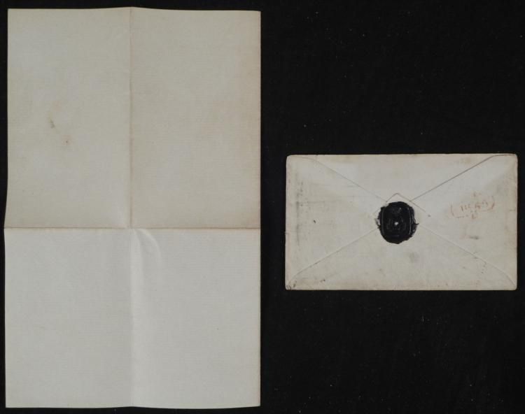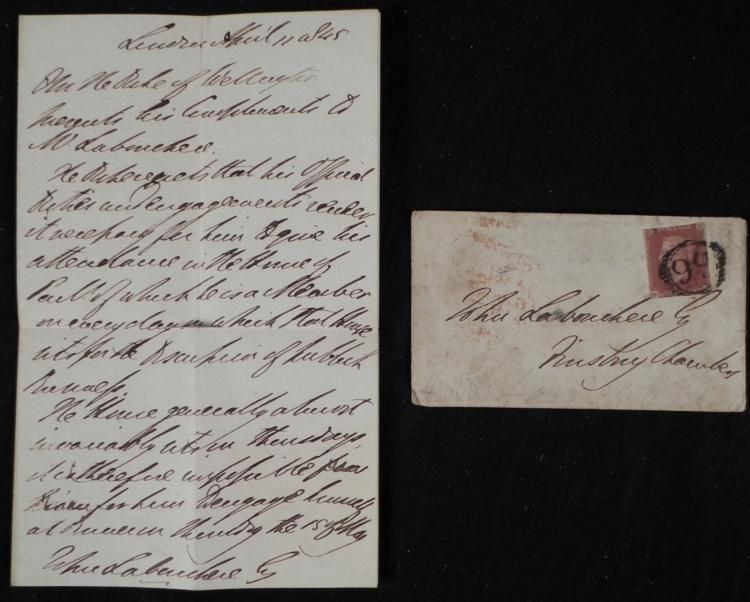 This letter was written on behalf of the Duke of Wellington. * It reads: "Duke of Wellington presents his compliments to W. Leboucher. The Duke regrets that his official duties and engagements render it necessary for him to give his attendance in the house of Parl. of which he is a member on every day in which that house sits for the discussion of public business." It is hand dated London, April 11, 1845. The envelope is addressed to W. Leboucher. The stationery is folded to 7 1/2 x 4 1/4 inches. There is some tears at the center creases. The envelope has a one penny stamp, postmarked, with black wax seal on the back. * This is a splendid letter from one of the leading military and political figures of the 19th century.