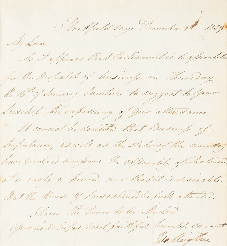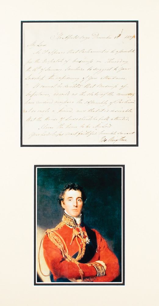 LS signed "Wellington," one page, 7.25 x 8, December 10, 1839. A letter addressed from Stratfield Saye, in full: "As it appears that Parliament is to assemble for the Dispatch of business on Thursday the 16th of January I venture to suggest to your Lordship the expediency of your attendance. It cannot be doubted that Business of Importance, as well as the state of the country have considered necessary the Assembly of Parliament at so early a period, and that it is desirable that the House of Lords should be fully attended." Double-matted with a portrait to an overall size of 10.5 x 20. In fine condition.