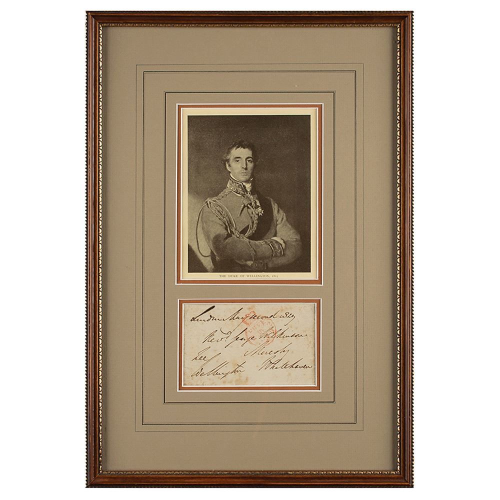 Hand-addressed envelope panel, 4.5 x 2.75, filled out in Wellington's hand and dated at "London, May second 1829," addressed to "Rev'd George Wilkinson, Moresby, Whitehaven," and franked in the lower left corner, "Free, Wellington." Double-matted and framed with a portrait to an overall size of 11.25 x 16.5; frame backing bears a Goodspeed's Book Shop label. In fine condition, with scattered light foxing.