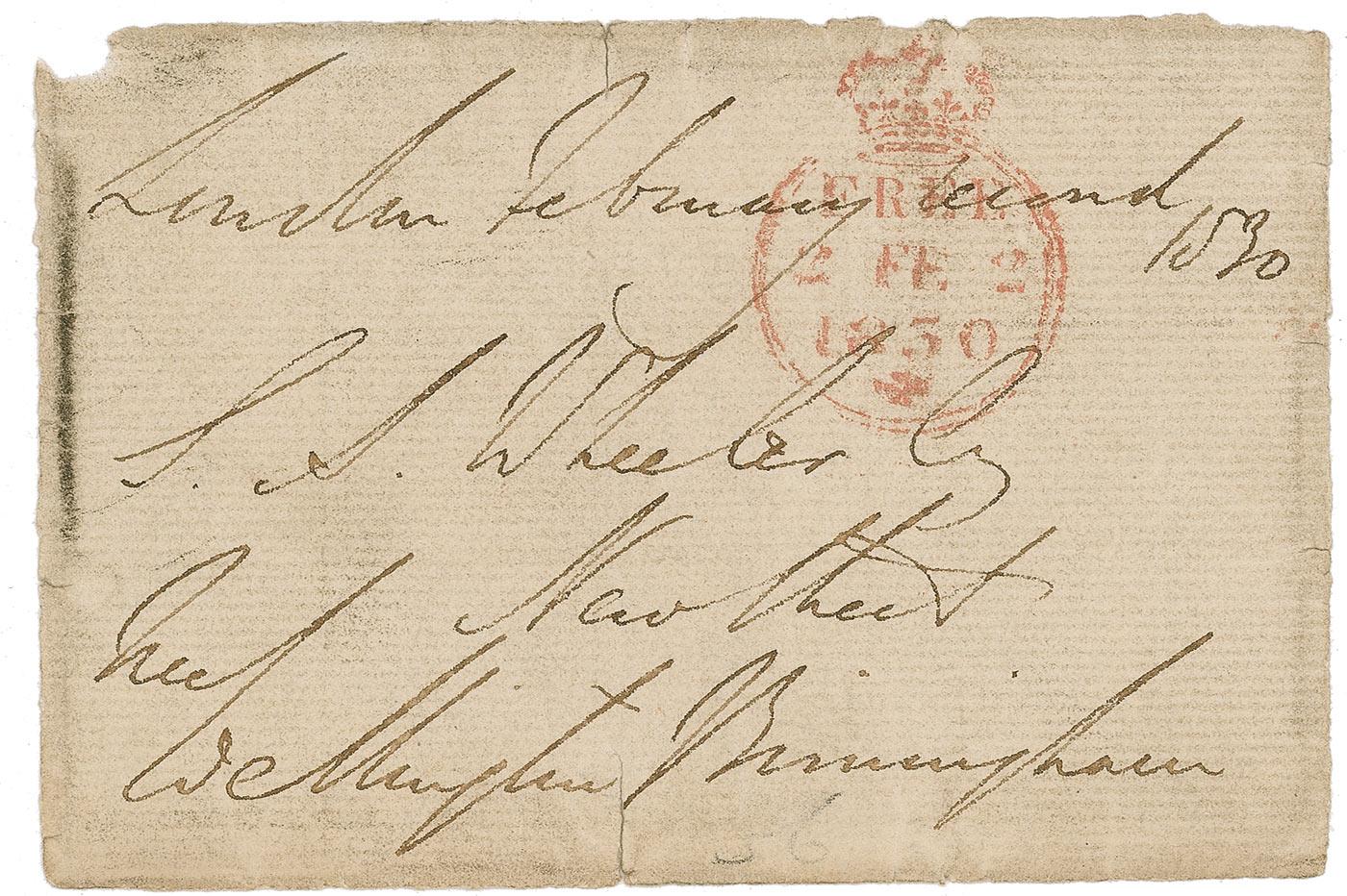 Hand-addressed free-franked envelope panel, 4.5 x 3, addressed by Wellington in his always difficult to decipher hand and signed at the bottom, “Free, Wellington” and bearing a “FREE, 1830” postmark. In very good condition with two small tears along a vertical center fold, missing upper left corner tip, chipping, and mild soiling.