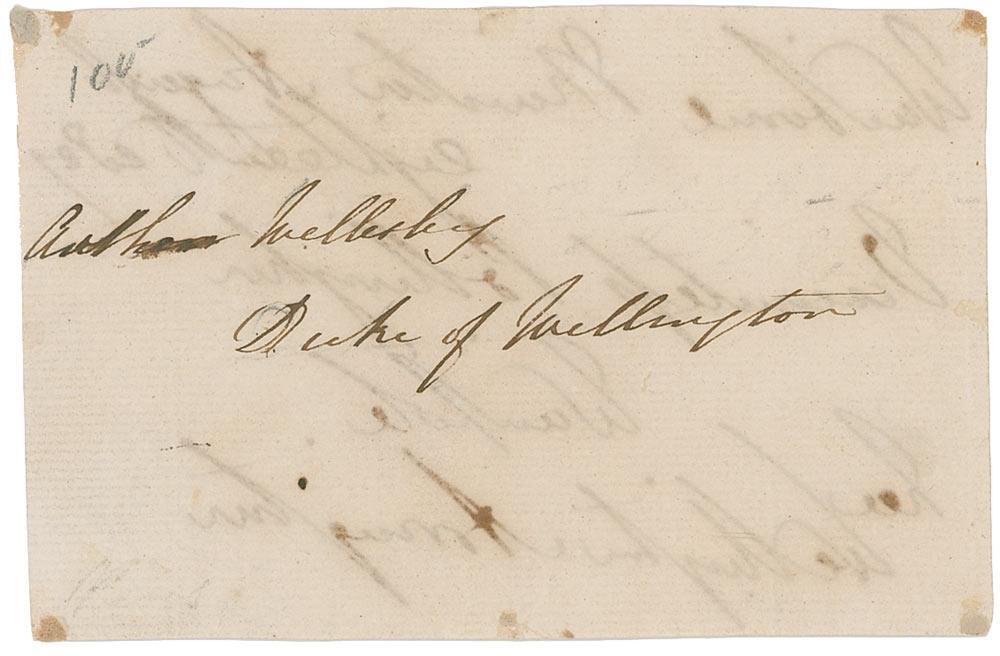 Clipped address panel, 4.5 x 3, addressed in Wellington’s difficult to decipher hand to “Viscountess Pollington,” and signed in the lower left “Free, Wellington.” Some scattered light toning, and mild show-through from writing on reverse, otherwise fine condition.