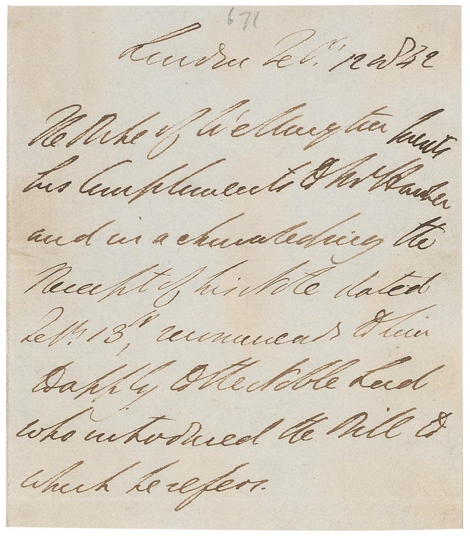 British soldier and statesman (1769–1852) who earned immortality for his stunning defeat of Napoleon at Waterloo and who later served in the British government, including a brief tenure as Prime Minister. Third person ALS, one page, 4.5 x 5, February 12, 1842. In part: “The Duke of Wellington presents his compliments…and in acknowledging the receipt of his note…recommends to him happily to the Noble Lord.” Scattered toning, central horizontal fold, and mounting remnants to reverse, otherwise fine condition.