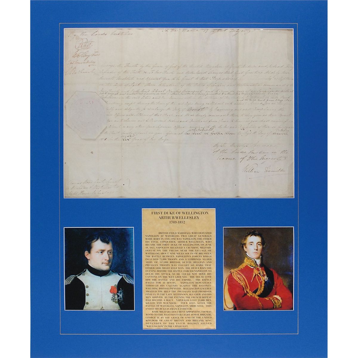 Rare manuscript DS, signed “Wellington,” one page, 15.25 x 11.25, October 8, 1821. Document appointing Thomas Wood as “Cornet…in the Corps of Light Horse Volunteers of the Cities of London and Westminster commanded by our Trusty and Welbeloved [sic]Colonel Charles Bosanquet.” Signed in the upper left by Wellington along with three other Lords Justices. Matted with two printed photos and a biography to an overall size of 20 x 24. The embossed paper seal affixed to the left side remains crisp and fully intact. In fine condition, with expected intersecting storage folds. A surprisingly scarce format, this is just the second Wellington document we have offered.