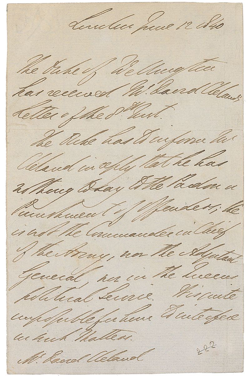 Third-person ALS, one page, 4.75 x 7.25, June 12, 1840. Letter to Mr. Cleland reads, in part: “The Duke of Wellington has received Mr.…Cleland’s letter of the 8th Inst. The Duke has to inform Mr. Cleland in reply that he has nothing to say to the Pardon or Punishment of offenders; he is not the Commander in Chief of the Army, nor the Adjutant General, nor in the Queen’s political service.” In fine condition, with some slight mounting remnants to reverse.