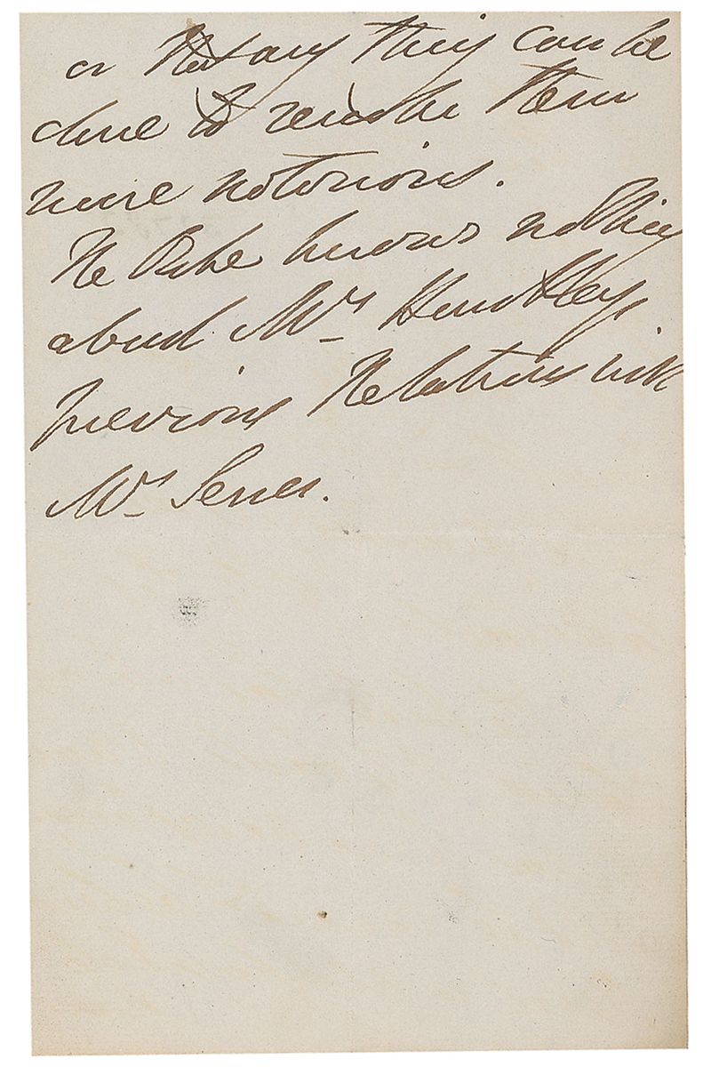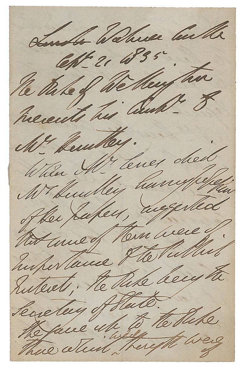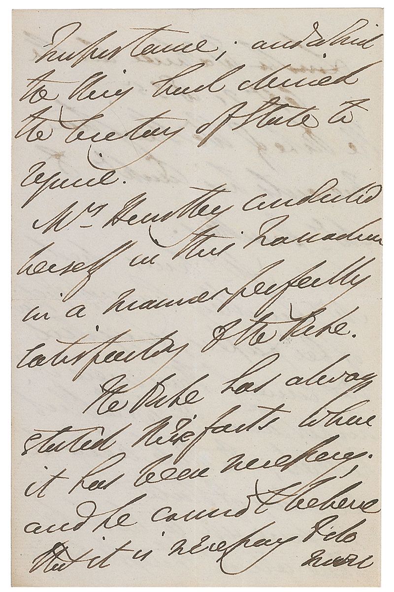 Third-person ALS, three pages on two adjoining sheets, 4.5 x 7, September 21, 1835. Letter to a gentleman. In part: “The Duke of Wellington presents his compl’ts to Mrs. Huntley. When Mr. Sener died, Mrs. Huntley having possession of his papers, suggested that some of them were of importance to the public interests; the Duke being the Secretary of State. She gave to the Duke those which she thought were of importance…The Duke has always stated the facts when it has been necessary…The Duke knows nothing about Mrs. Huntley’s previous relations with Mr. Sener.” In fine condition, with central vertical and horizontal folds.