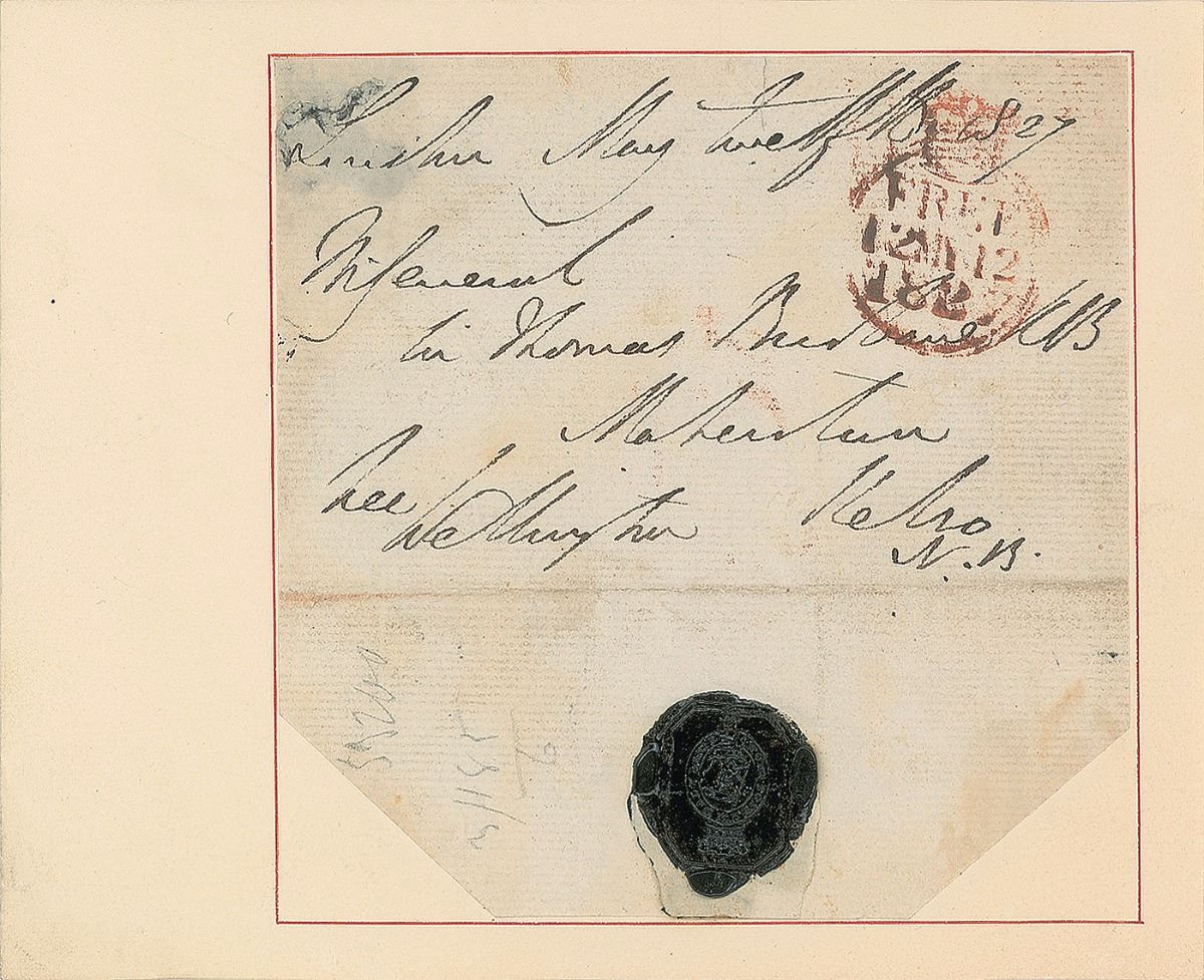Hand-addressed and free franked envelope panel, 4.5 x 4.25, signed in the lower left, “Free, Wellington,” and addressed in his hand and dated “London, May twelfth 1827.” Affixed to a larger sheet and in very good to fine condition, with scattered overall soiling.