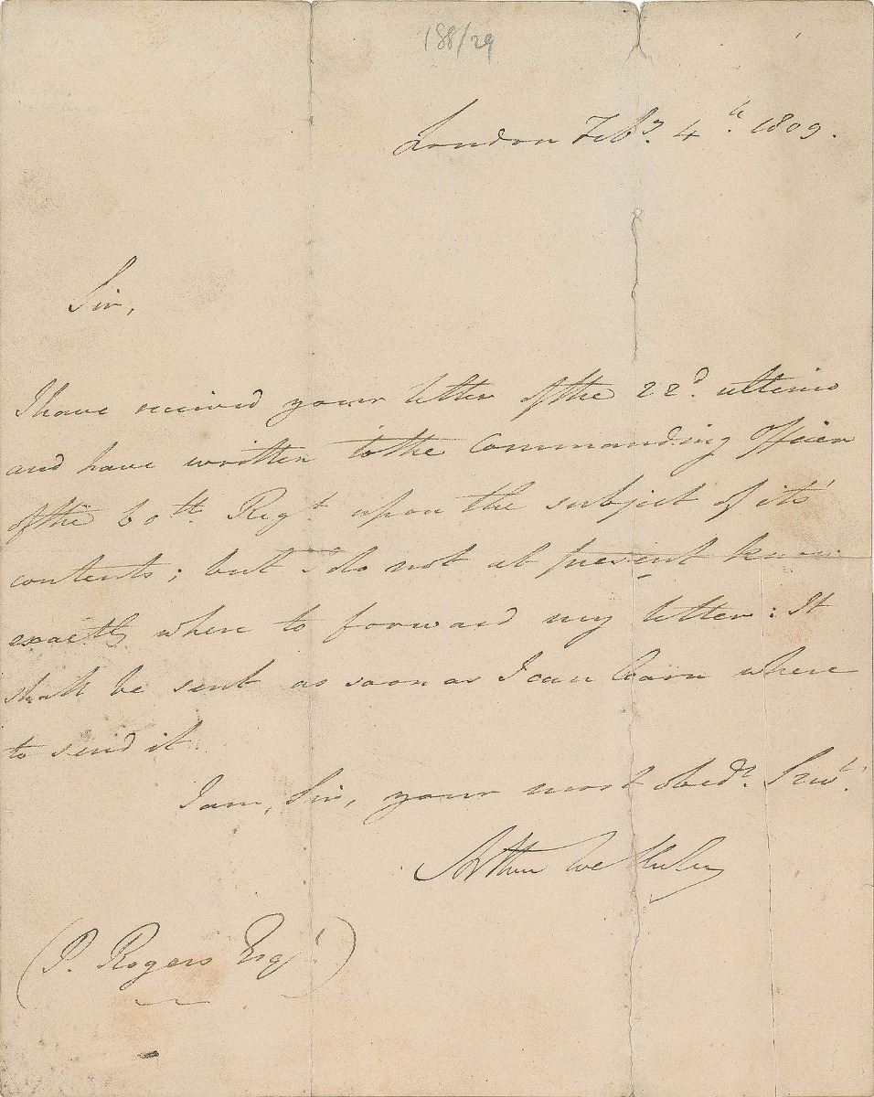 ALS signed “Arthur Wellesley,” one page, 8.5 x 10.5, February 4, 1809. Letter to P. Rogers, in full: "I have received your letter of the 22d ultimo and have written to the commanding officer of the 60th Regt upon the subject of its contents; but I do not at present know exactly where to forward my letter; It shall be sent as soon as I can learn where to send it." In very good to fine condition, with archival tape on the reverse to reinforce intersecting folds and two tears (one of which passes vertically through the signature). An early letter from the hero of the Peninsular Wars, still five years removed from earning his title of Duke of Wellington. Additionally, this is the only "Arthur Wellesley" signed item we've ever handled.