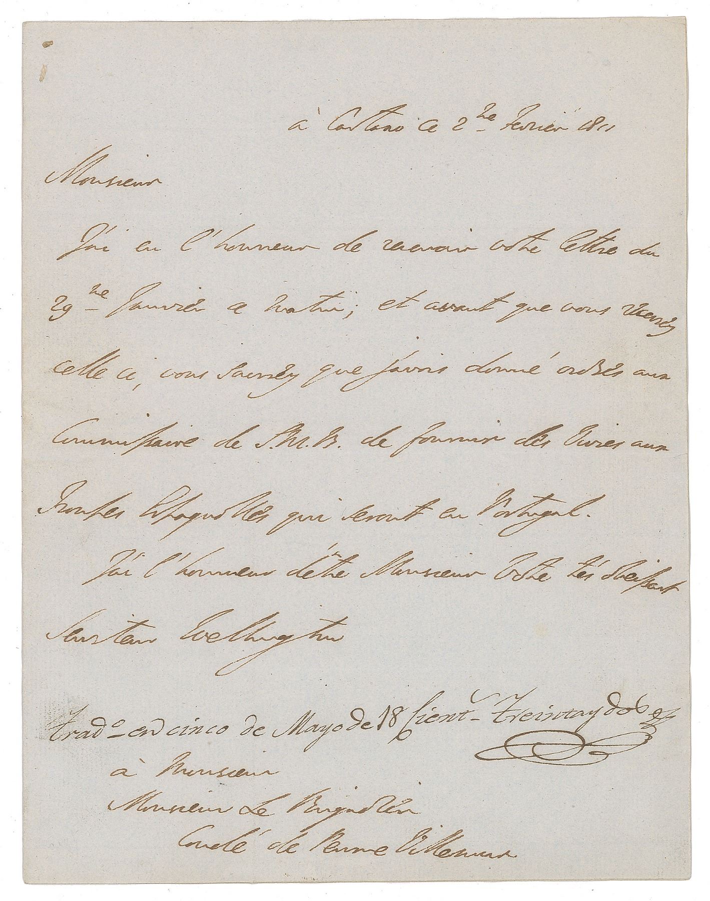 Anglo-Irish soldier and statesman, victor over Napoleon Bonaparte at Waterloo and twice elected Prime Minister (1769-1852). ALS in French, signed “Wellington,” one page, 7.25 x 9.25, February 2, 1811. Untranslated letter to "Monsieur Le Brigadier," responding to a letter sent on January 29th. In fine condition.