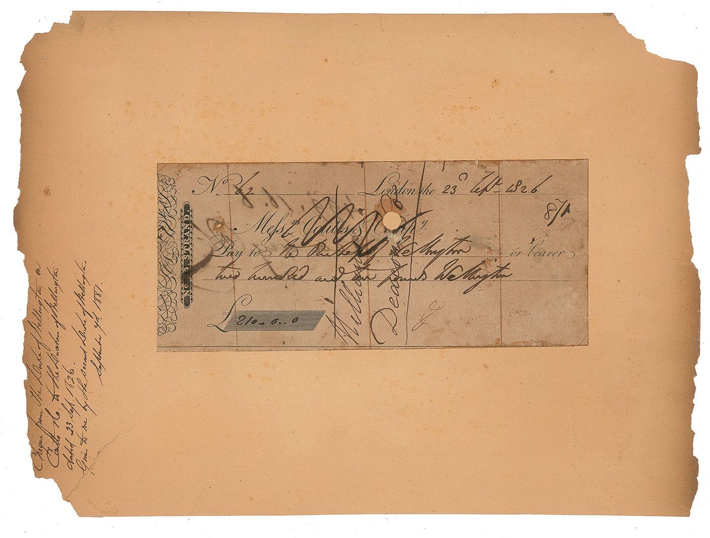 Coutts & Company bank check, 7.25 x 3.25, filled out and signed by Wellington, "Wellington," payable to his wife, "The Duchess of Wellington" for £210, September 23, 1826. Affixed to a larger scrapbook page, annotated in the margin by a collector, in part: "Given to me by the second Duke of Wellington, September 7th 1881." In very good condition, with several vertical folds, light toning, and staining. A scarce example, this is the first Wellington check we've ever offered.