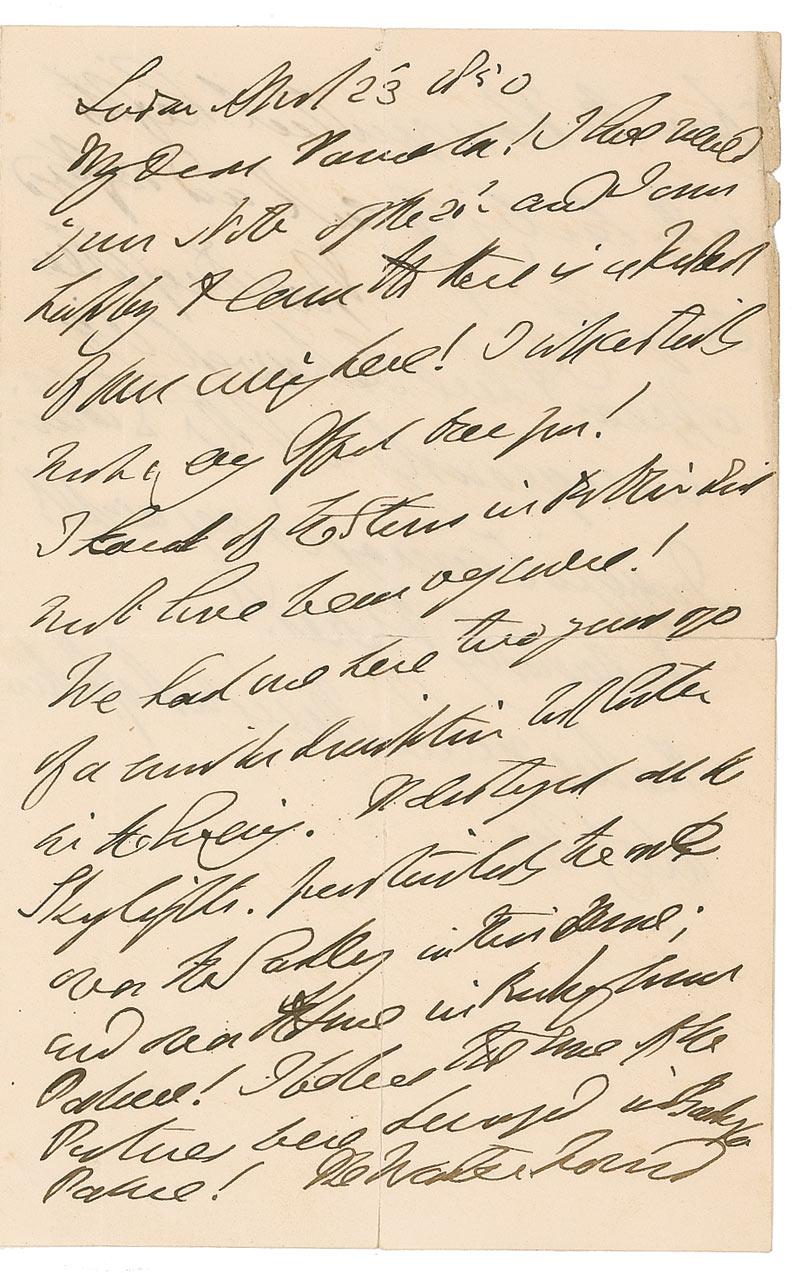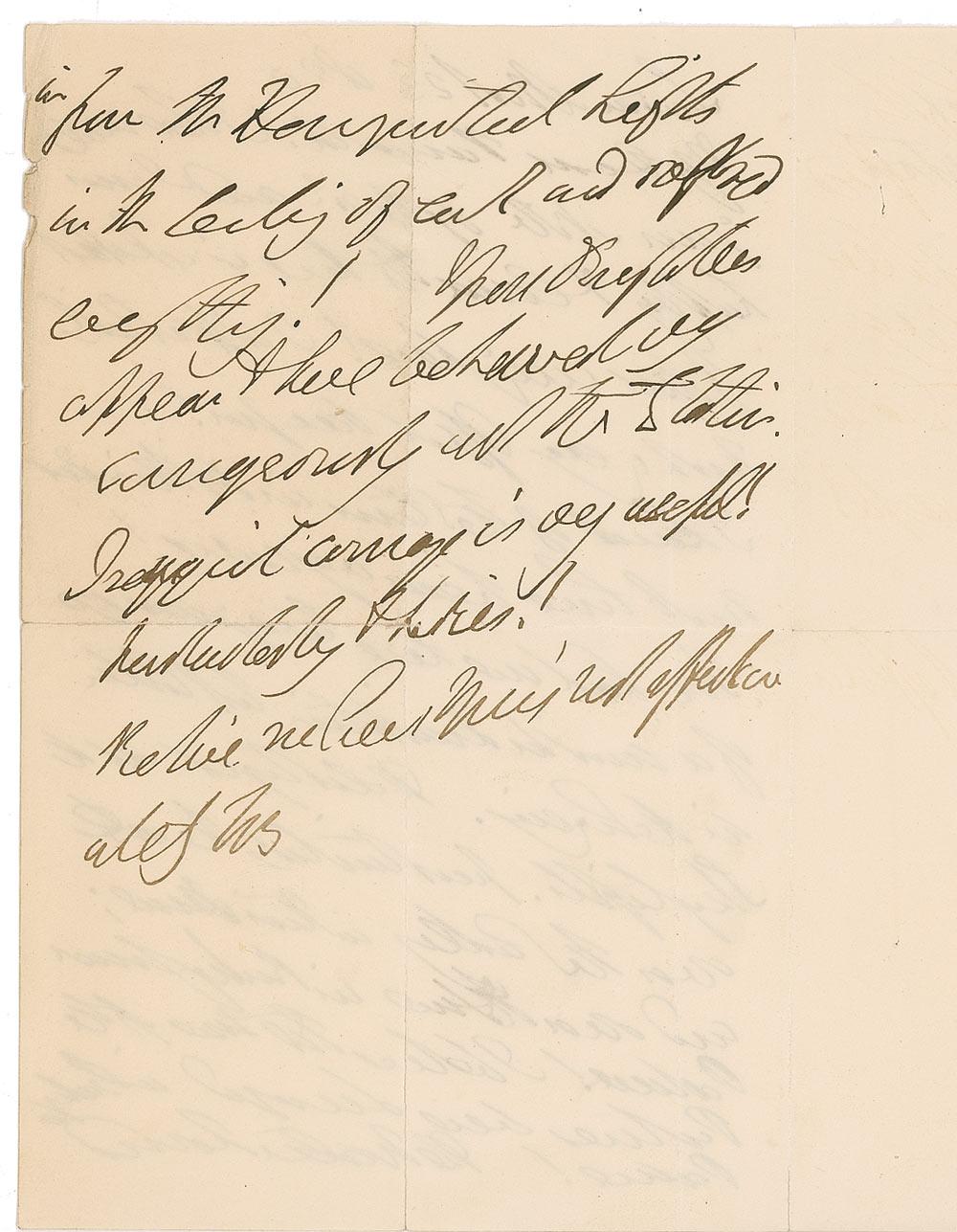British soldier and statesman (1769–1852) who earned immortality for his stunning defeat of Napoleon at Waterloo and who later served in the British government, including a brief tenure as Prime Minister. ALS signed “W,” one page both sides, 4.5 x 7.25, April 23, 1850. Wellington replies to a recently received message in his difficult-to-decipher hand, and commends the action of an individual. In part: “[It] appears they behaved very courageously.” In very good condition, with intersecting mailing folds, separations along a horizontal and vertical fold, two edge dings along the right side, and writing showing through from opposing sides.