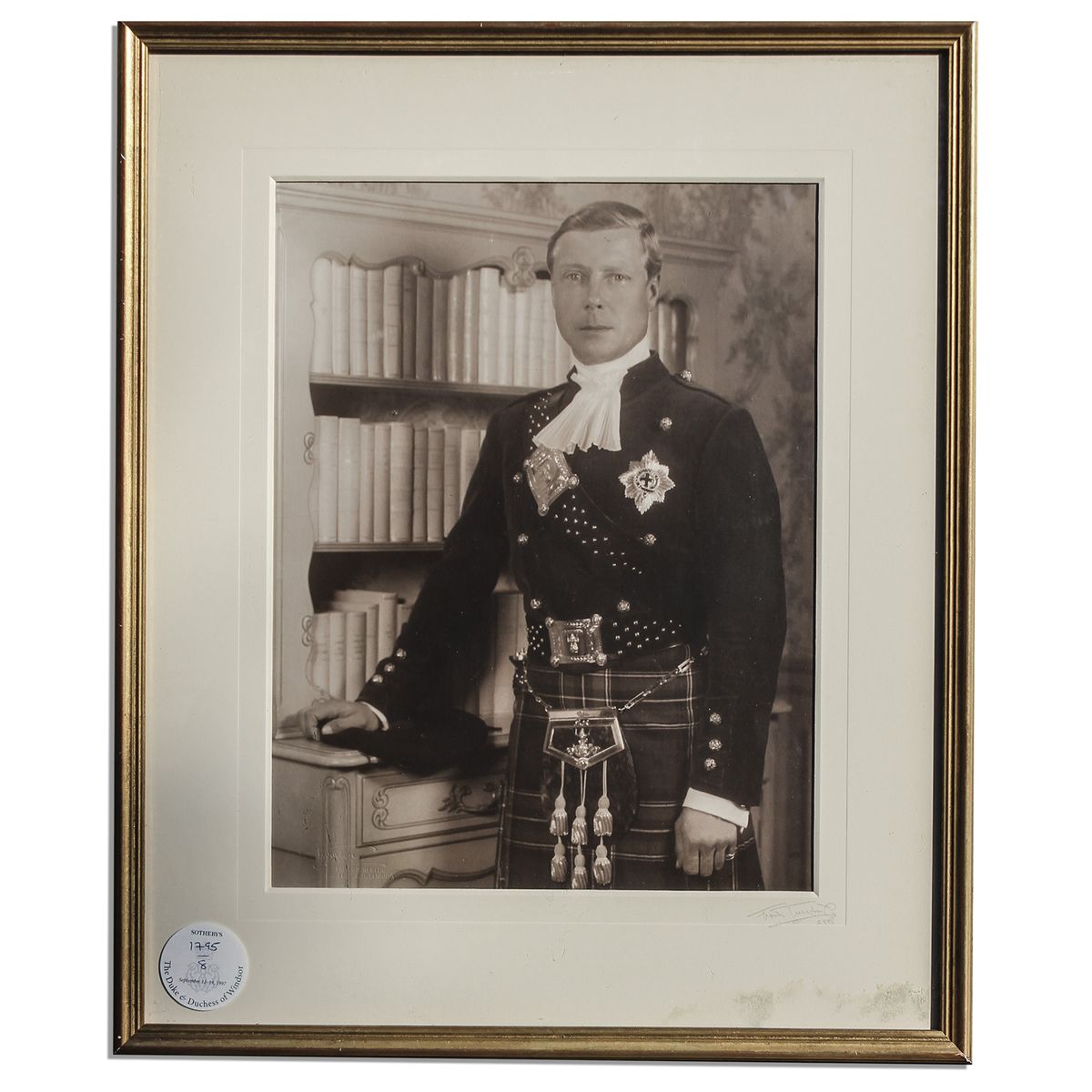 Vintage photo of the Duke of Windsor, Edward VIII. Portrait of the Royal in a kilt and regalia was taken by celebrity photographer Frank Turgeon, who signs the mat in pencil. His blind stamp is present to lower left corner of the photo. Matted and framed to an overall size of 15.75'' x 19.25''. Some discoloration to the mat at lower right. Photo has not been removed from the frame for further inspection but appears near fine. Provenance from Sotheby's September 11-19 1997 Duke & Duchess of Windsor auction and with Sotheby's tags.
