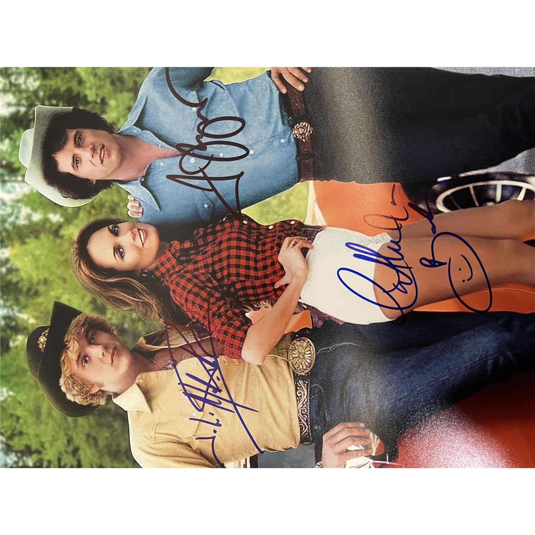 Dukes of Hazzard cast signed photo autographed by Catherine Bach, John Schneider, Tom Wopat. 8x10 inches