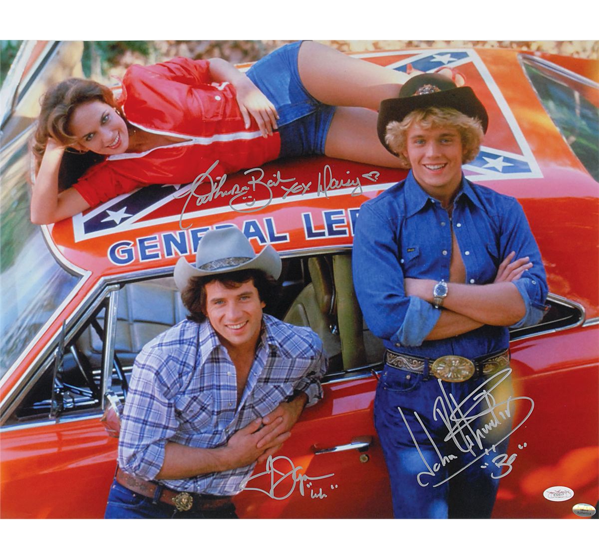 Color satin-finish 20 x 16 photo of Bo, Luke, and Daisy Duke posing with the General Lee, signed in silver ink by Tom Wopat, John Schneider, and Catherine Bach, all adding their character names. In fine condition, with a James Spence authentication label affixed to lower corner. Accompanied by a certificate of authenticity from James Spence.