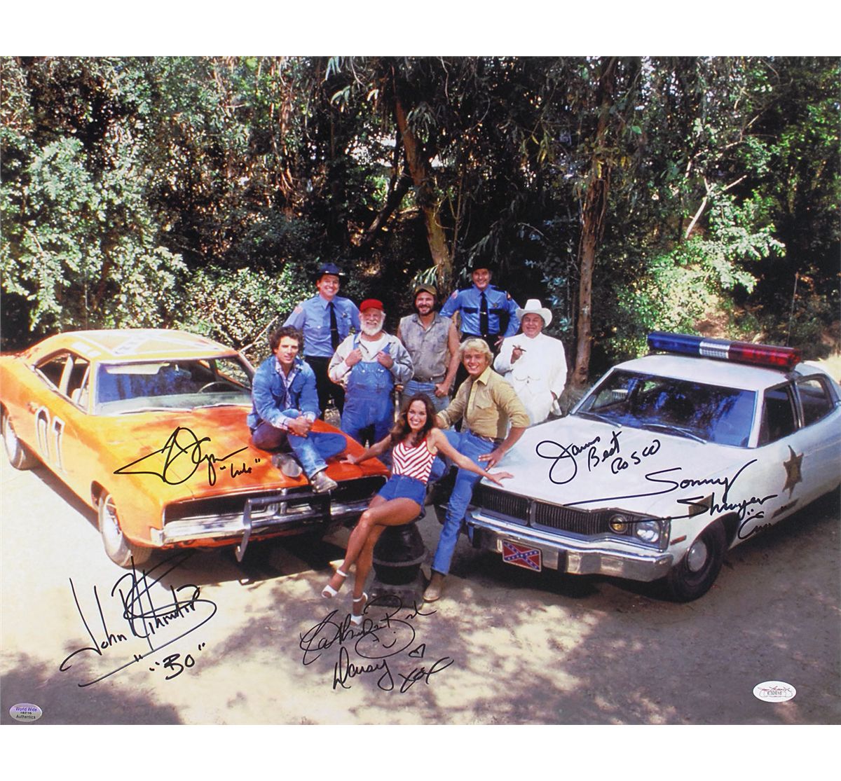 Color satin-finish 20 x 16 photo of the cast with their famous cars, signed in black felt tip by Tom Wopat, John Schneider, Catherine Bach, Sonny Shroyer, and James Best, with all of them adding the names of their characters. In fine condition.