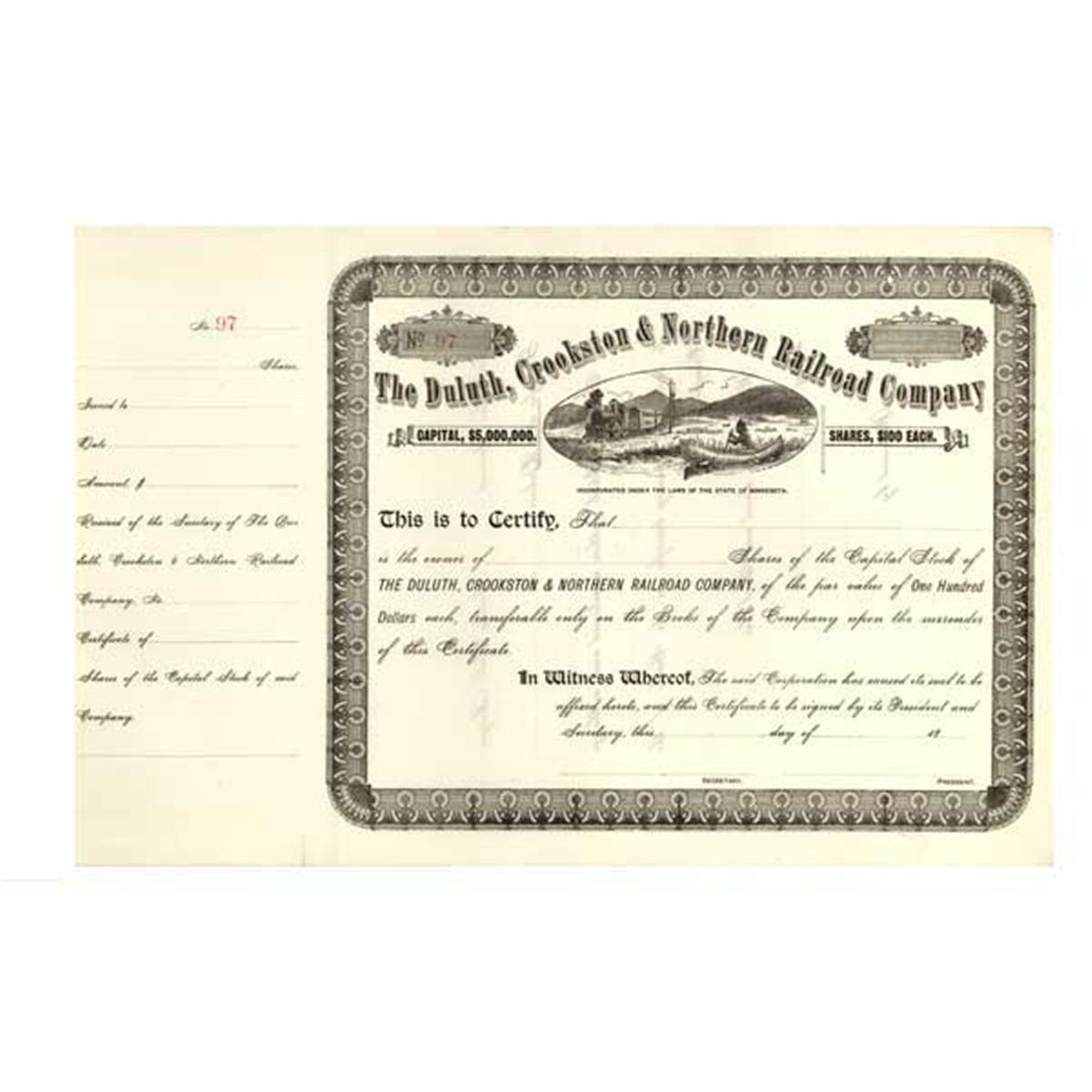 18--. Minnesota. Unissued stock certificate. Black/white. Vignette of a train passing a river with an Indian paddling a canoe. Litho. Uncancelled and Excellent.