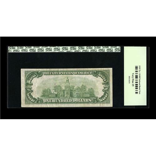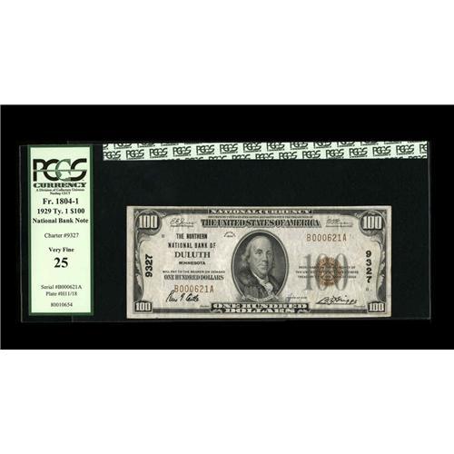 <B>Duluth, MN</B></I> - $100 1929 Ty. 1 <B>The Northern NB</B></I> Ch. # 9327<BR>A scant five banks in the entire state issued the Type 1 $100. The Northern issued only the $50 and $100 denomination in small size. An important offering for the Minnesota collecting fraternity and likely to stir considerable bidding interest. <B>PCGS Very Fine 25</B></I> and retaining considerable crispness.