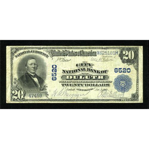 <B>Duluth, MN</B></I> - $20 1902 Plain Back Fr. 650 <B>The City NB</B></I> Ch. # 6520<BR> A pleasing <B>Very Fine</B></I> with legible stamped signatures.<BR><BR><b>Shipping:</b> Coins & Currency (<a target="_blank" href="http://www.heritageauctions.com/common/shipping.php">view shipping information</a>)