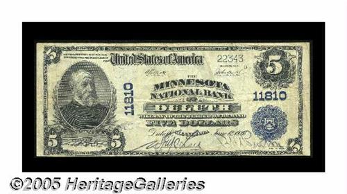 <B>Duluth, MN</B></I> - $5 1902 Plain Back Fr. 607 <B>The Minnesota NB</B></I> Ch. # 11810<BR>This institution from a busy Lake Superior shipping center confined its emissions to the $5 and $10 denominations in the Plain Back and 1929 designs. <B>Very Fine.</B></I>