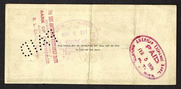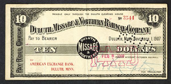 Minnesota. 10 Dollar Pay Roll check issued and cancelled perforated PAID. Paid thru the Duluth Clearing House.