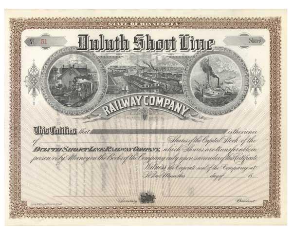 18--. Minnesota. Unissued stock certificate. Brown/Black. A Gorgeous triple vignette at top center depicting a city dock scene at center flanked by a steam locomotive and ship.
